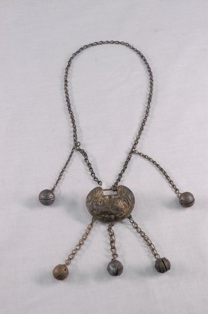 1. 本件為掛鈴鍊圈配上荷包形鎖盒,鎖盒的正、反兩面刻有「長」、「命」兩字為特點,並有兩隻躍然向上的魚龍紋飾環繞。「長命」二字代表「長命百歲」之意,希望小孩鎖上長命鎖能無災無殃,長命百歲;而刻有魚龍,象徵小孩將來能「鯉躍龍門」,考上科舉為官,功成名就。