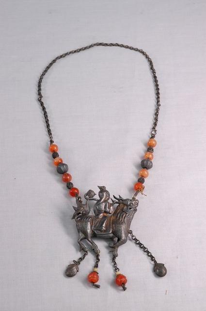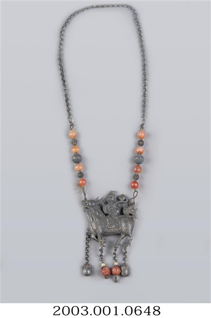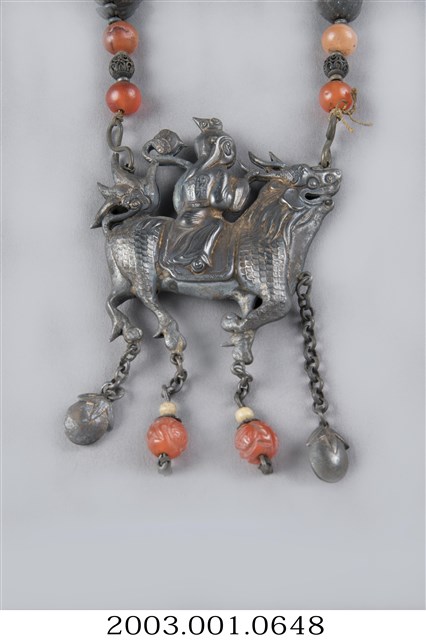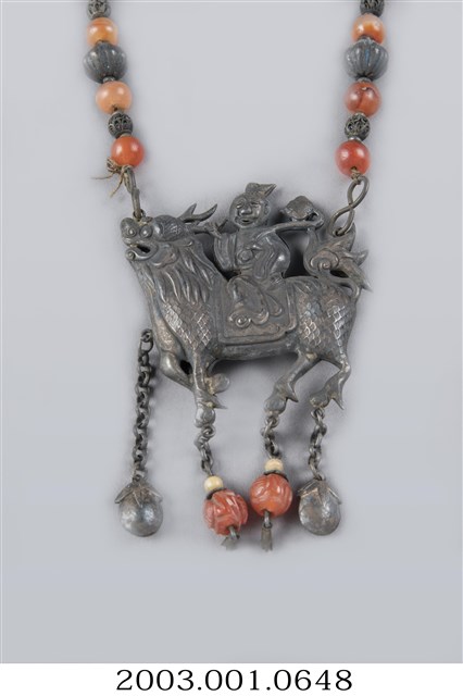1. 本件長命鎖並非是以鎖盒方式呈現,而是以「麒麟送子」造型為雕刻,是戴冠穿袍的童子,手持如意,騎在麒麟身上。而在麒麟的頭、尾鍊以瑪瑙珠鍊圈。在麒麟底下則有四條鍊條,中間兩條有瑪瑙珠串,左右兩邊則是瓜果造型的垂飾。2. 「麒麟送子」最早典故出自晉朝傳說孔子誕生之前,他的母親夢見麒麟吐書,孔子遂誕生。後世以此形成手持蓮花或如意的戴冠童子騎乘在麒麟上,象徵「連生貴子」或「如意得子」。此類多由孩童配戴,期望長大成人,能有成就富貴。