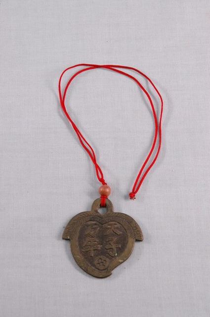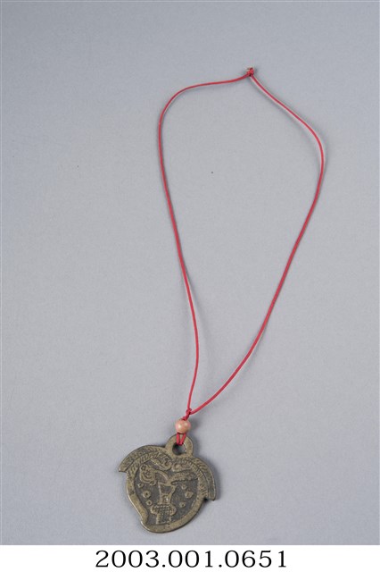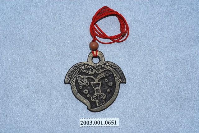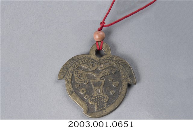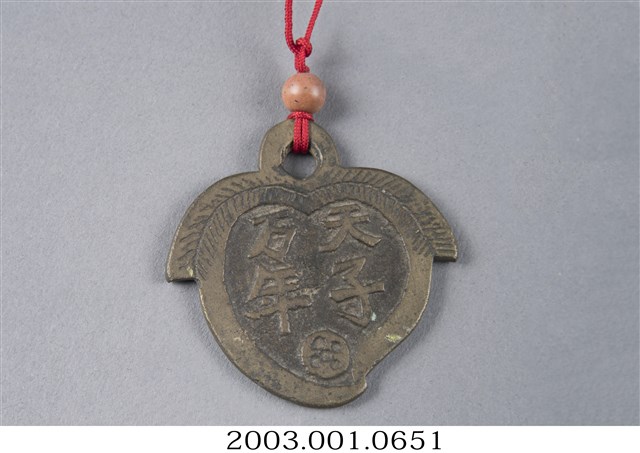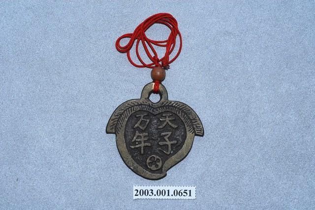 1. 本件厭勝錢,其一面刻有「天子萬年」的字樣,另一面刻有花瓶,內中插有蓮葉。整件外觀為桃子形狀,並配有一條木隔珠的紅繩圈。2. 厭勝錢又稱「花錢」,「厭勝」之意是指壓制、勝過邪惡或不好的事物;又因此種錢幣是民間自行鑄造使用,有許多花樣紋飾,故稱「花錢」,多用在民俗喜慶或博弈方面。本件一面刻字「天子萬年」,是祈求孩子受天庇佑,可如同皇帝天子一般,長命富貴;另一面刻蓮葉插瓶,是象徵連(蓮)年平安之意。這種厭勝錢多配掛在小孩身上。