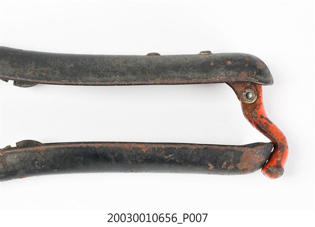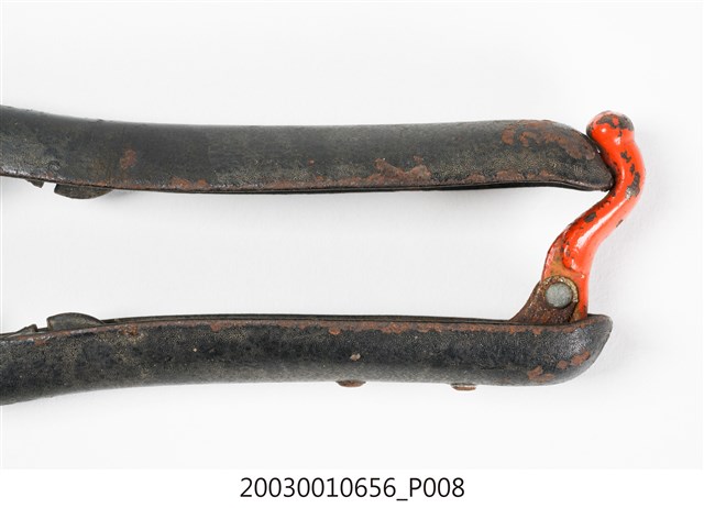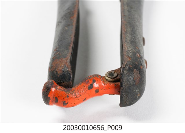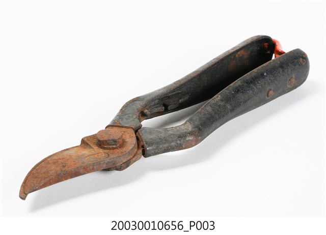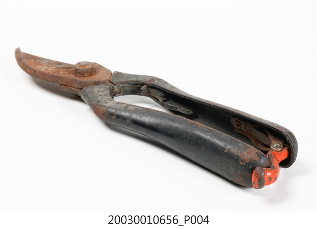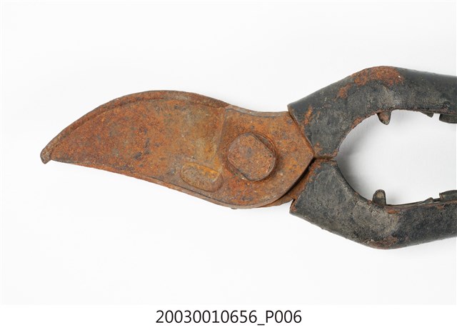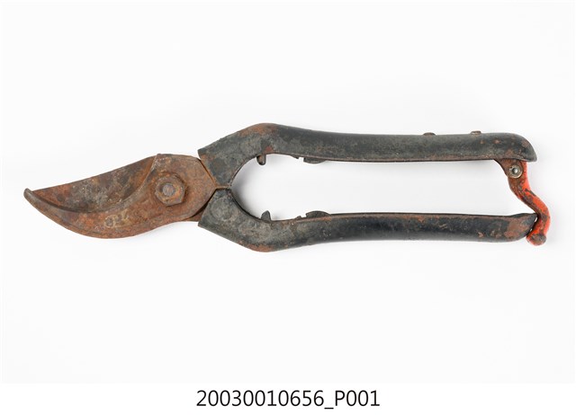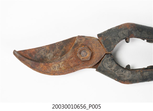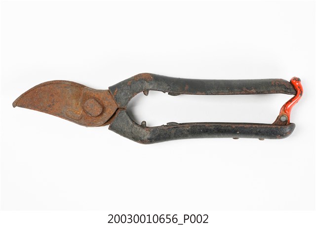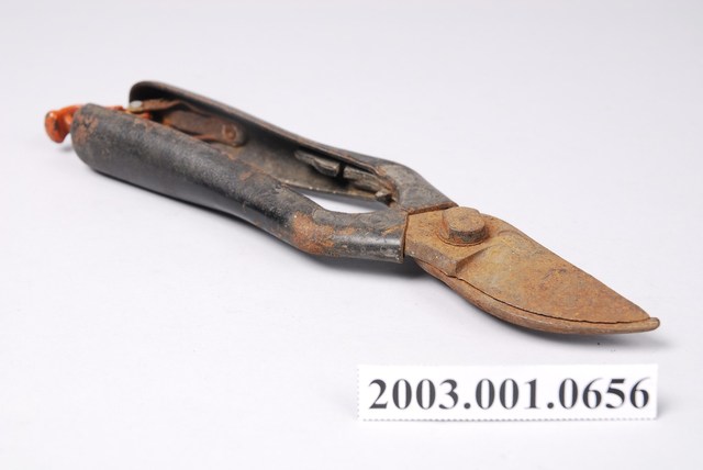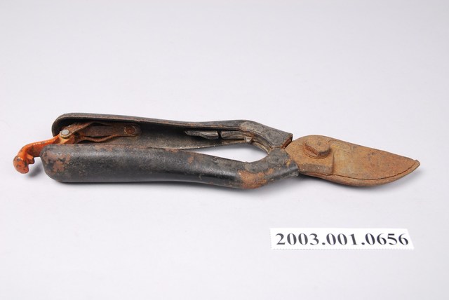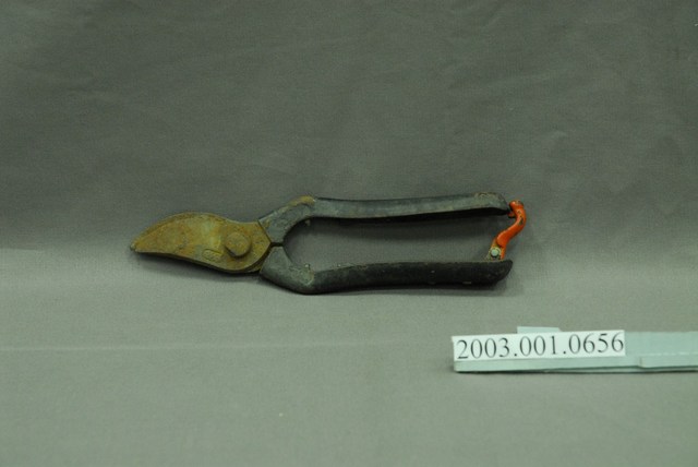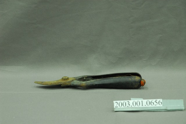 本文物為花剪,為園藝工具,用以修剪小枝花葉。剪刀運用槓桿原理,刀片於斜面刀刃後端交叉,以可活動螺絲固定,螺絲後端為刀柄。花剪為弧形刀刃,一寬一窄,切剪方式與傳統鍘刀相同,窄版刀刃為鈍面,用以勾置小枝,寬版刀刃具刃面,用以切斷。刀柄為直條,為鉗類柄型式,以手掌包握壓合施力,力道較大。刀柄前端原有彈簧節省開合施力,已不存,尾端做鉤,二柄勾住時壓縮彈簧,使刀刃保持閉合,以利收納。花剪為戰後由日本傳入工具,非臺灣傳統農具。