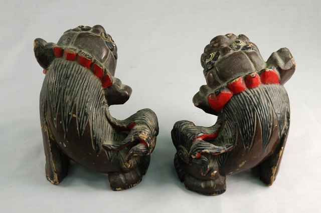 本文物為木雕獅組,一組兩件,為同一對。獅為圓雕,底面平整,應為立於桌面的擺飾藝品。二獅一公一母,公獅腳踩銅錢,母獅抓小獅,獅頭大身小,後腳蹲前腳立起。造型耳上揚,嘴大開,腳踩銅錢,尾部鬃毛高舉,較似臺灣清光緒年間以後獅造型。木雕上褐色底漆,鬃毛為紅漆,口及尾下部施紅漆,牙塗白,點黑白眼,在臺灣為戰後做法。但亦可能來自中國。獅為傳統吉祥圖樣太獅少獅,諧音古高官太師與少師,象徵仕途順遂之意。