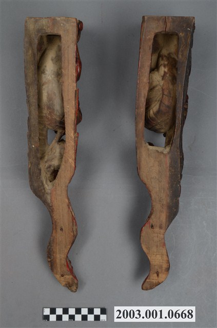 本文物為獅木雕組,一組兩件,為同一對。為紅眠床床架之裝飾,頭下腳上的倒爬獅造型。二獅同為母獅帶小獅的太獅少獅造型,獅耳上揚,背上鬃毛做尖突狀。獅子等精細雕刻是清代以後家具的特色,作法延續至今。本件木雕上紅色底漆,獅體正面鬃毛部分覆金漆。唯臺灣紅眠床少用倒爬獅裝飾,本組文物可能來自中國。獅為傳統吉祥圖樣太獅少獅,諧音古高官太師與少師,象徵仕途順遂之意。