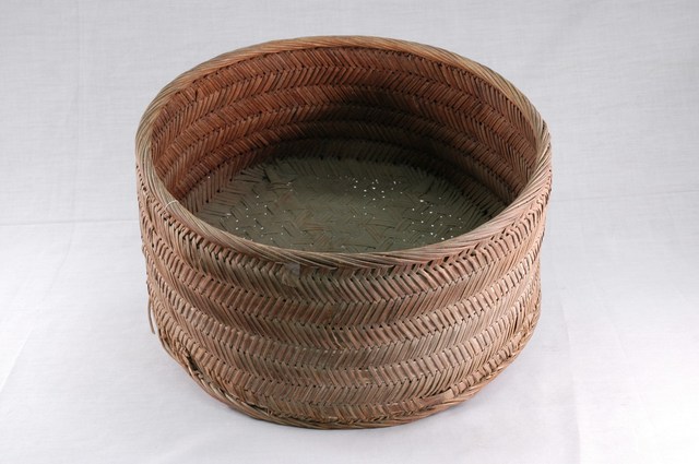 1.竹編圓形筒狀雜物籃。底部採三角孔編法,並以兩根厚竹片,成X字型插入底部,以加強底部承受力;籃身採人字紋編法,立邊處與收口處採繩紋編。因經久使用與年代稍遠,竹篾光澤幾乎已盡失,籃底有些微破損的狀況。2.早年台灣農業社會時期多使用竹編製品,此件是一般民家中常見用來放置各式雜物的竹籃,亦可常見於廚房中,用來放置蔬果、根莖作物等。