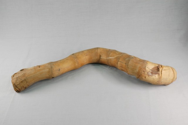1.本物件為竹製牛軛。該物件為一體成形,兩端等高,可看見竹子的中空處;中段向外彎曲,物件表面可見一節一節的竹節及細微裂痕。