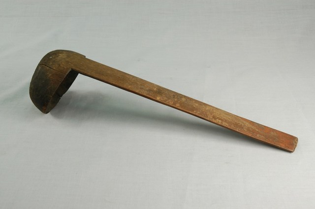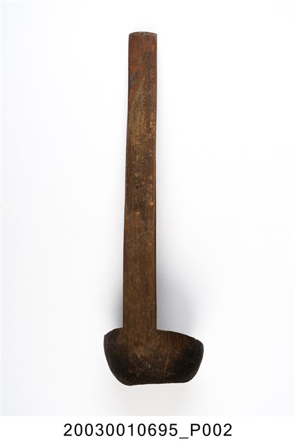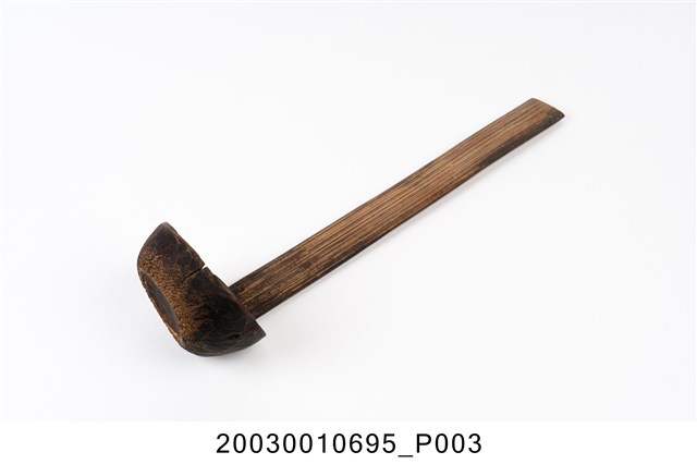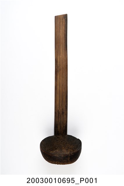 1.木匙,長34.4 cm、寬9.5 cm、高8.8 cm, 湯勺部呈現圓形瓢勺狀,有一道明顯裂痕;柄部呈長條形,木紋明顯,柄端與勺部角度較為垂直,器表通體無紋飾。有明顯長期使用的痕跡。