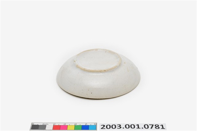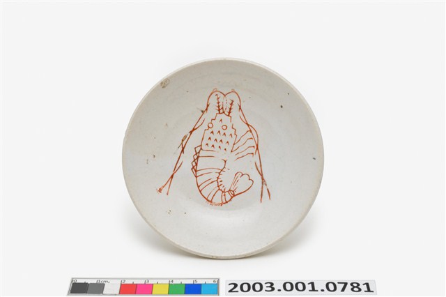 小碟以壓模製成胎體,敞口圓唇,淺弧腹,圈足,胎色米白略帶雜質,內外施白釉,盤底無廠商印款,為臺灣早期大量生產的食器。紅蝦紋樣位於盤心,蝦身輪廓以印模圖案蓋印上色釉,蝦鬚等身長,僅有印模輪廓而未有手繪加彩。「蝦紋」常見於臺灣早期盤碟裝飾,餐桌上有魚有蝦,象徵富裕,此外,蝦的腰呈鎧形,而又能自由彎曲,並有很大的跳動力,所以寓意時來運轉與順利。這類描繪身體彎曲,蝦足前張,長鬚向後仰的蝦圖又叫「彎彎順」,是盤碟上蝦紋的標準模式。