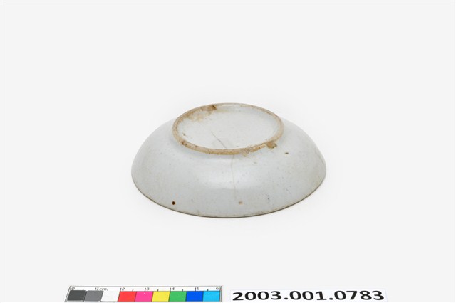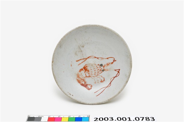 小碟以壓模製成胎體,敞口圓唇,淺弧腹,圈足,胎色米黃,內外施白釉,盤底無廠商印款,為臺灣早期大量生產的食器。盤心蝦紋輪廓以印模圖案蓋印上色釉,並手繪加彩點出蝦眼,蝦鬚略短於彎曲身長。「蝦紋」常見於臺灣早期盤碟裝飾,餐桌上有魚有蝦,象徵富裕,此外,蝦的腰呈鎧形,而又能自由彎曲,並有很大的跳動力,所以寓意時來運轉與順利。這類描繪身體彎曲,蝦足前張,長鬚向後仰的蝦圖又叫「彎彎順」,是盤碟上蝦紋的標準模式。