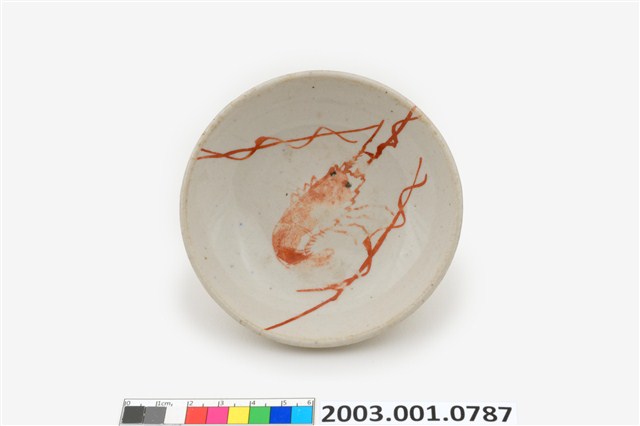 小碟以壓模製成胎體,敞口圓唇,淺弧腹,圈足,胎色米黃,內外施白釉,盤底多沾粘雜質,無廠商印款,為臺灣早期大量生產的食器。盤心蝦身輪廓以印模圖案蓋印上色釉,手繪蝦鬚,並加彩點出蝦眼、於蝦身塗色。蝦鬚長於彎曲蝦身,往兩側伸展觸及口沿。此類釉上彩餐具經實際使用後會導致脫彩,可見蝦紋漫渙脫落。「蝦紋」常見於臺灣早期盤碟裝飾,餐桌上有魚有蝦,象徵富裕,此外,蝦的腰呈鎧形,而又能自由彎曲,並有很大的跳動力,所以寓意時來運轉與順利。這類描繪身體彎曲,蝦足前張,長鬚向後仰的蝦圖又叫「彎彎順」,是盤碟上蝦紋的標準模式。