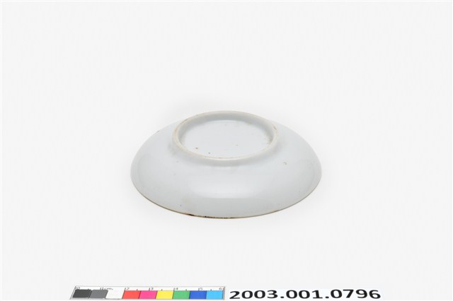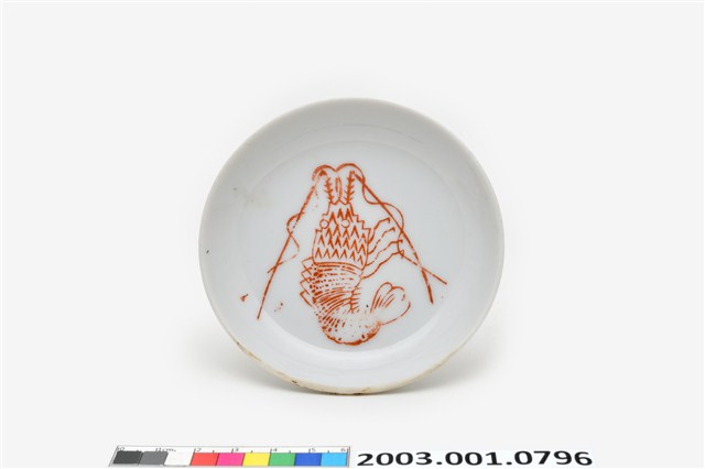 小碟造型敞口圓唇,淺弧腹,圈足,以壓模製成胎體,胎色白帶米灰,通體施釉至圈足尖,釉色乳白清亮,盤底無製造商印,為臺灣早期大量生產的食器。盤心蝦紋僅以印模圖案蓋印上色釉,表現蝦頭尖刺、蝦身多環節卷曲,以及波形與長線條交錯蝦鬚。「蝦紋」常見於臺灣早期盤碟裝飾,餐桌上有魚有蝦,象徵富裕,此外,蝦的腰呈鎧形,而又能自由彎曲,並有很大的跳動力,所以寓意時來運轉與順利。這類描繪身體彎曲,蝦足前張,長鬚向後折的蝦圖又叫「彎彎順」,是盤碟上蝦紋的標準模式。