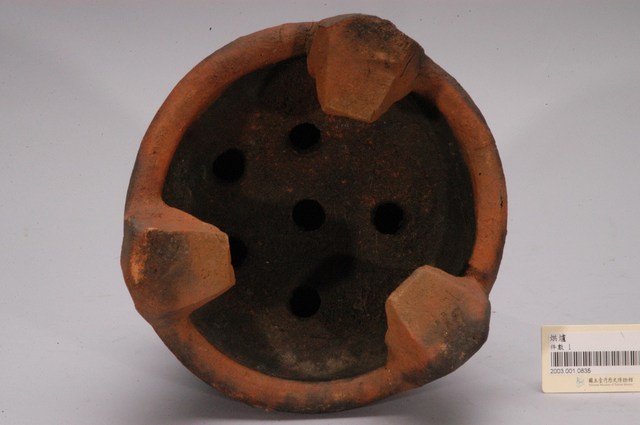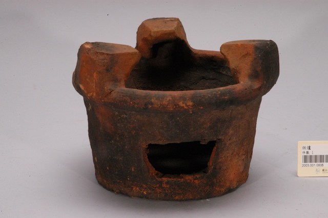 素燒陶製烘爐,為小型的爐灶,用來燒煮食物。圓桶形,上寬下窄,廣口,口緣上方有三個方形凸起可安放鍋子或茶壺。爐內分上下二部分,夾層鑿有六個小孔,可將炭火放在上層,燃盡的碳灰透過孔洞落到爐底,側面下方設有通風口,以調節火候。