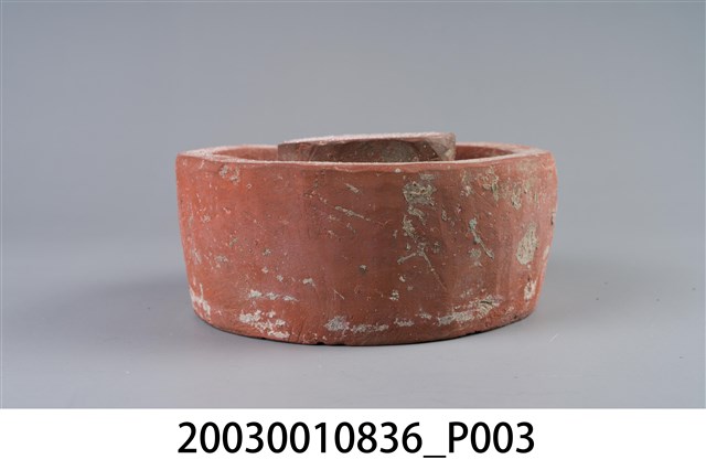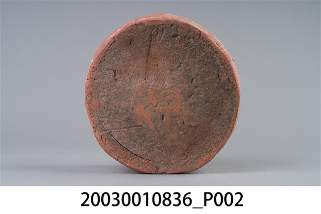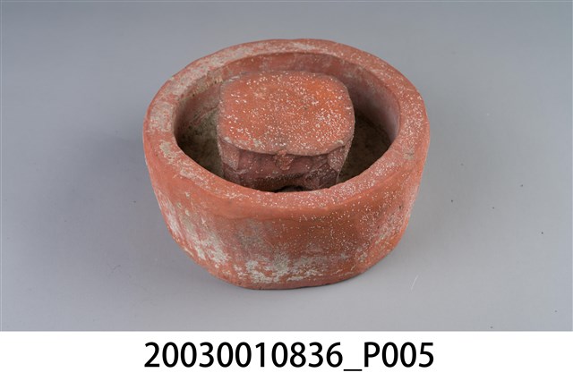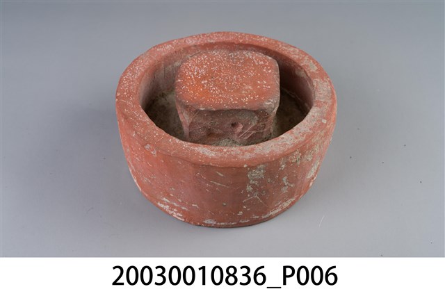 1. 本件為圓形素燒紅陶桌腳墊,長17.5公分、寬17.1公分、高7.8公分,胎體緻密,質似紅磚,不施釉,外圍器壁為不規整的圓形,中間凸起為不規則方柱形。2. 桌腳墊是傳統廚房防蟲用具,器形以方形、圓形為多,質材多元,有陶製、瓷製、石製等。將櫥櫃、餐桌四足各立於桌腳墊上,溝槽承水防止害蟲入侵,是故又被稱為蟻除、櫥仔腳。本件此類質似紅磚的素燒紅陶,以臺南「歸仁窯」最為人所知,推斷本件即屬此地所產。