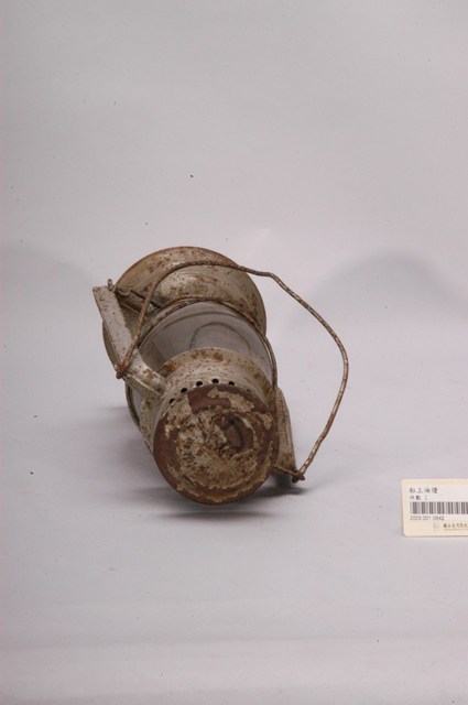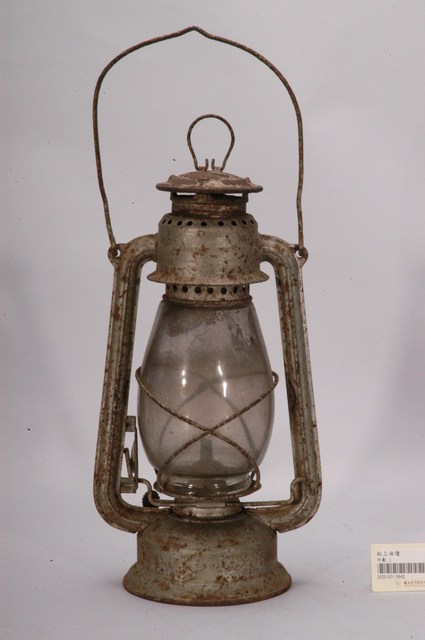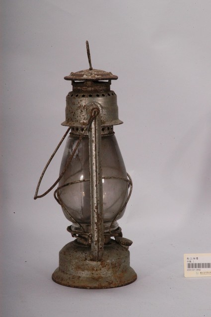 本物件為煤油燈,為鐵製基座與玻璃燈罩組合而成。鐵製基座銀色,有些許銹蝕,上方的掛環與兩側連接的鐵絲,可讓煤油燈掛在工作地點。燈罩上面寫有「MADE IN U.S.A」,可以判斷該煤油燈應為美國製造。燈罩連接基座的部分,可以放燈芯。煤油燈為電燈普及之前的主要照明工具,以煤油作為燃料。