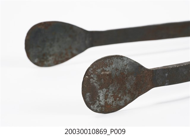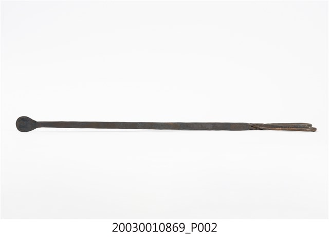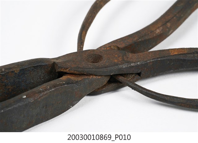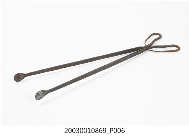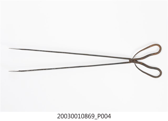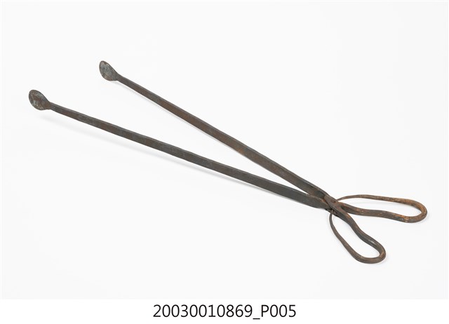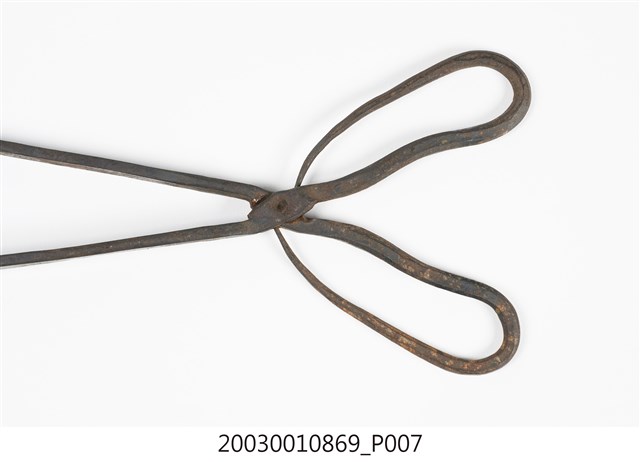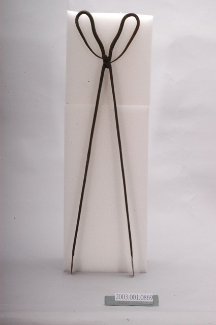 本文物為火鉗,又稱鐵鉗、火夾,為打鐵店從火爐內夾取高溫鐵件,或家庭廚房由燒炭爐灶內夾取燃燒炭的工具。火鉗以二支鐵條交叉,疊合處以螺絲固定。本件火鉗鉗頭為直條,前端壓扁為片狀,利於夾住片狀物。螺絲後端彎折為圈形柄。火鉗長度較長,便於深入高溫爐中夾取及避免拿取時遭高溫鐵件或木炭燙傷。