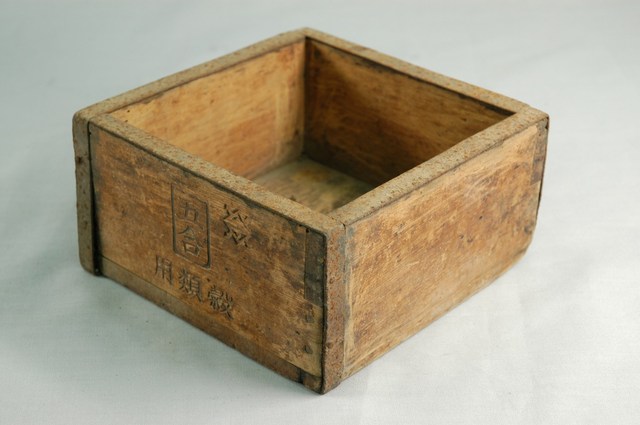 1.本物件為臺灣總督府的官賣度量衡器,為木製方形米斗,上記有「五合」、「穀類用」,及臺灣總督府官方認可量器押蓋的火戳,為兩個倒三角形各立四腳的圖徽,此米斗容量為五合,依日制約為900毫升。