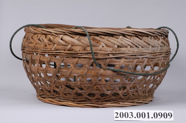 1.本件籮筐,竹製,為上下稍窄,中腹稍胖的圓桶造型,籮筐底部以三角孔編法,並編有圈足,再以三枝竹片交疊補強,筐身則編成六角形孔洞狀 ,並加繫綠色塑膠繩以利挑擔之用,口緣採輪口收邊法,使筐身更加牢固耐用,筐身與筐底都為大孔目,通常用來盛裝較輕的物品,如裝運蔬菜之用。2. 臺灣因竹材取得容易,臺灣原住民及明朝起移入的漢民便已有自製簡單的竹器用品,隨後陸續有竹製品從中國輸入販賣,至清朝光緒初年,已有臺南竹仔街、嘉義竹街、鹿港竹篾街等竹材、竹器店聚集成市的形成。