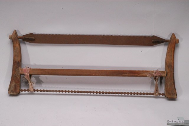 本文物為臺灣鋸,又稱框鋸、拐鋸、架鋸,是木作司傅使用的臺灣傳統鋸,為與日本鋸區隔而稱為臺灣鋸。木鋸框為二層架形式,連接鋸片兩端為圓形握柄夾桿,可旋轉以調整鋸片角度。與鋸條垂直的兩端木條為握柄。與鋸條平行的木條,近端為調整桿,以鐵鎚敲擊移動調整桿,可鬆開或夾緊夾桿,以調整鋸條角度;遠端鐵鍊條為支撐桿,兩端與握柄相嵌,形成固定的支撐結構。為避免調整桿掉落,以尼龍繩將支撐桿和調整桿綁在一起。本件以平頭鐵釘固定夾桿與鋸條。鐵鍊條為1960年代以後材料。臺灣鋸為推鋸,使用時手握握桿,向下推出時施力,拉回時則輕拉。本件握柄上有「清誥」文字,可能為店號或使用者人名。