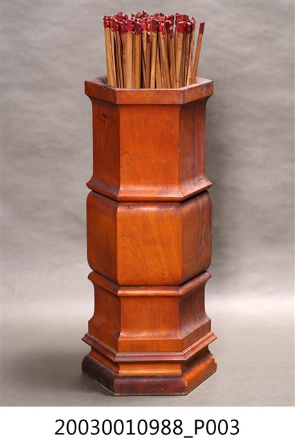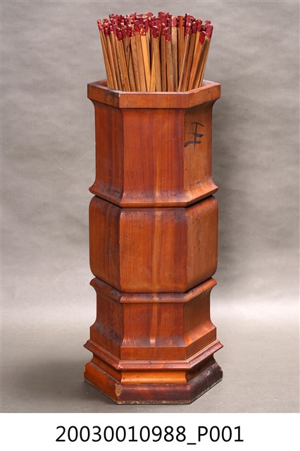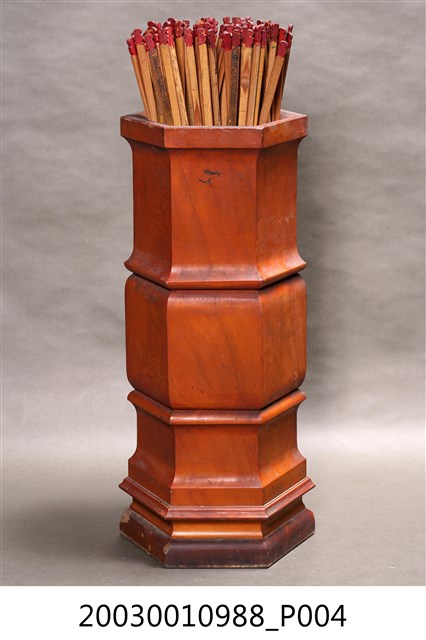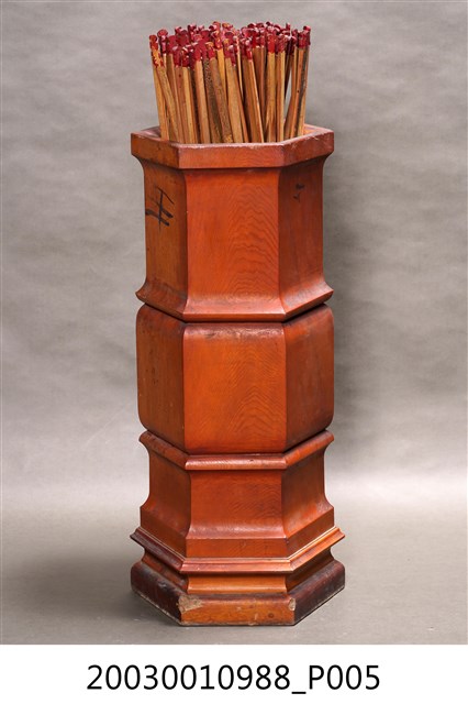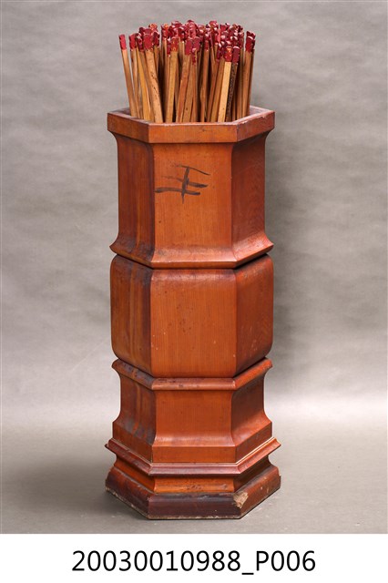 本件為六角木籤筒,桶身並雕出兩節橫紋作為裝飾,內置竹籤。此組竹籤乃以一、三、五等奇數號編碼,至199號,共100支籤。靈籤是各寺廟常見的宗教文物,是一種提供神人溝通的工具,信徒透過對神明的祈求後,通常經擲筊獲神明應允,搖動籤筒抽取浮出的靈籤,並擲筊請示是否是此籤,獲聖筊後,便可對照籤號抽取籤詩。