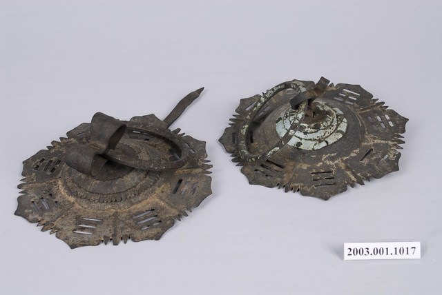 本件文物為門環組,一組兩件,但此兩件並非同一對,單件館藏號分別為2003.001.1017.0001及1003.001.1017.0002。門環又稱鋪首、門鈸,用於木板門上,有鐵或銅兩種材質。本組門環裝設時以掛有環的鈕釘在下。本件門環由凸圓形金屬片、雙結形鈕釘與環圈組成。雙結形鈕釘後方帶兩片針腳,以穿過板門孔洞後固定。環圈穿入鈕釘的下孔,為手拉之處,鈕釘上孔可裝置鎖或長條門閂以固定門片。本組金屬片外圍菱花形,並作鏤空八卦圖案,為臺灣傳統建築門環常見形式。本組兩件雖基本圖案相同,但繁簡作法有異,非出自同一模具打造。本組門環為鐵製,局部有鏽蝕。由其中一件局部上漆,另一件未上漆,顯示使用歷程不同,推測本組兩件非使用於同一對門板上。