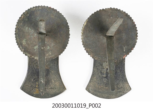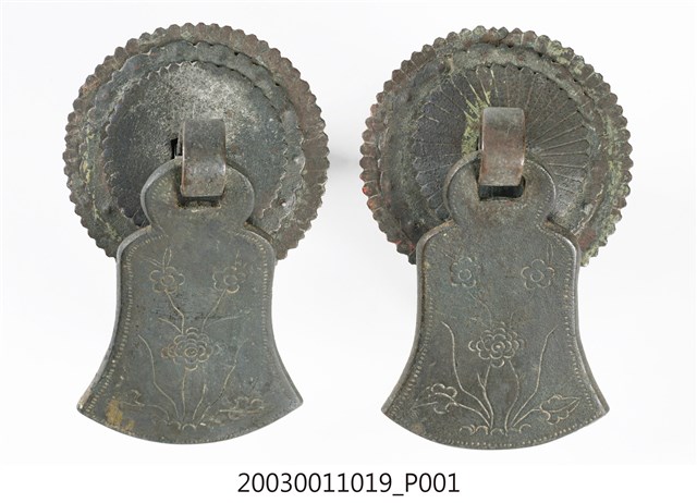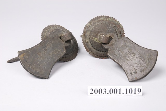 本件文物為櫥櫃的把手,一組兩件,單件館藏號為2003.001.1019.0001及2003.001.1019.0002,兩件的墜相同,但圓形鐵片作法細節不同,非同一對。把手用於木櫃門上。中國大陸稱櫥櫃把手為拉手。本件把手由三層圓形鐵片、針腳與鐘形墜組成。針腳穿過櫃門孔洞後固定,鍾形墜則為手拉之處。墜上有陰刻牡丹與梅圖案,雖為傳統吉祥題材,但配置與表現方式與傳統不同,推測為戰後出現的仿古把手。