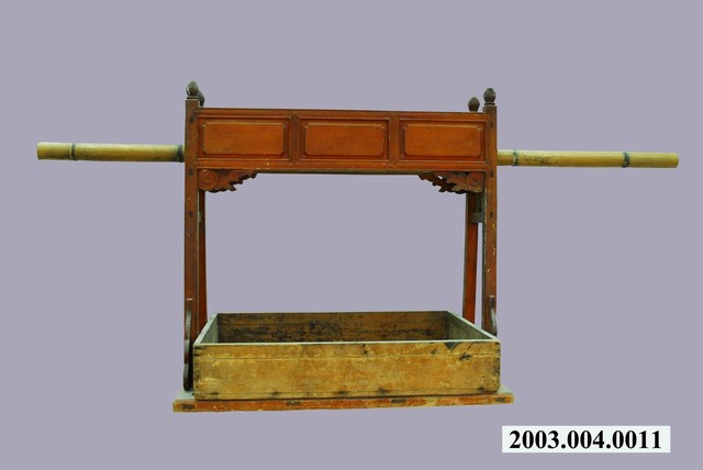 1.本件為木𣛮,可分為三個部分,長方體箱盒、提樑和竹桿。箱盒由薄木板利用卯榫和金屬釘製作成長方體,提樑有底座寬闊著地,並有裝飾性構件,如雀替和站牙,竹桿穿越孔洞,可供扛抬。2.木𣛮是結婚禮俗中,男方向女方舉行大聘時,用來裝盛和展示各項聘禮的方形盒子。木𣛮在喜餅店或販賣婚嫁用品的商店,提供租賃或免費給客人使用。