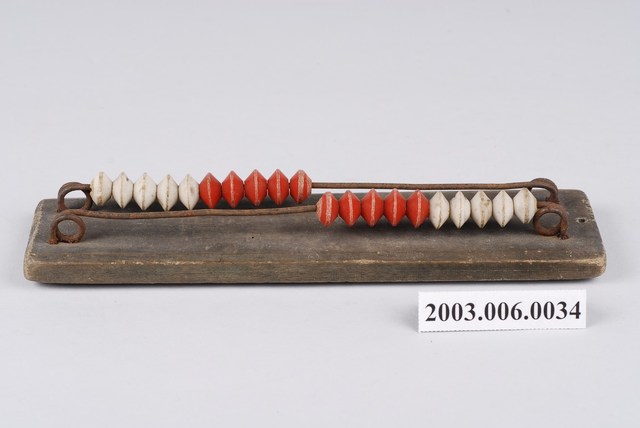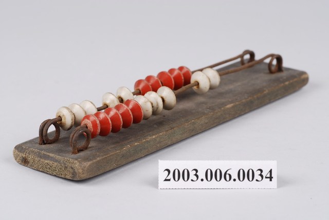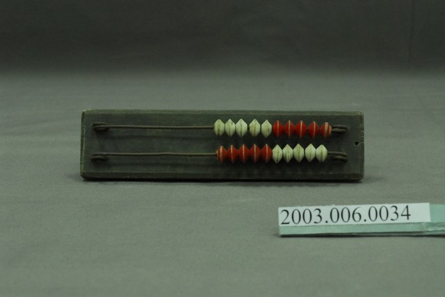 1.本物件為早期幼童學習計算輔助工具,上有兩鐵線各串著5個白算珠和5個紅算珠