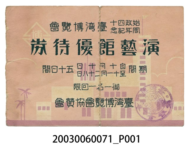 1.本物件為施政四十週年紀念臺灣博覽會演藝館優待券,以米色為底,另有建築物剪影,會期自昭和10年10月10日至昭和10年11月28日。上方寫有「始政四十周年記念臺灣博覽會」。中間寫著「演藝館優待券」,下方的「御一名一回限」意即限一人入場,使用一次為限,右下角有一臺灣博覽會章。2.1935年,日本統治臺灣40周年,臺灣在經濟、生產、教育、交通等各方面都已經有一定的成長與發展。同時臺灣也是近代日本第一個海外殖民地,因此臺灣經營的成果具有指標性的意義,代表日本向外擴張的實力證明。因此總督府有意舉辦大型博覽會,在1934年就通過博覽會補助費60萬元的預算,訂於1935年10月10日起50天內舉行「始政四十周年紀念臺灣博覽會」。用以宣傳臺灣的殖民成果與經驗,另外,宣傳「臺灣為南進基地」、「臺灣觀光」兩大政策也是重要目的。展覽架構是以臺灣為主要重心,展示日本對臺灣的各是建設開發以及臺灣特有物產。臺灣博覽會是殖民政策下的產物,有濃厚的政治意圖,但也完整呈現了臺灣當時的各項生活表現。