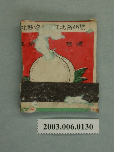 1.本物件為永光火柴公司之火柴紙,上有「YUNG KUANG MATCH」字樣,中有一猴子圖樣,下方為「YUNG KUANG MATCH INDUSTRIAL CO.」,即為永光火柴工業公司,反面有一桃子圖樣與「專用商標」四字。此物件經摺疊,無法判定是紙張或是火柴盒拆卸過後壓縮而成,從汐止鎮此行政區可看出此物件時間位於光復後。