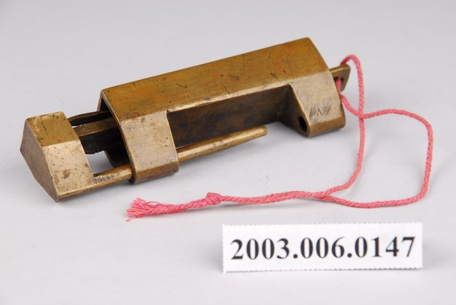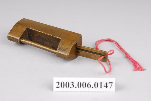 1.紅銅製橫式鎖具,又稱「廣鎖」,鎖頭上部呈三角形,下部呈正方形。本件為需要鑰匙開啟的簧片構造鎖,鑰匙孔開在側面,形狀為文字形「一字」,本件鑰匙用紅繩綁在鎖樑上。2.金屬鎖的大量使用始於東漢,分為簧片構造鎖與文字組合鎖兩大類,常用於鎖門、鎖櫃、鎖箱、…等。簧片構造鎖構造分為鎖樑、鎖栓、彈簧片、鎖梗、鎖體、鑰匙。文字形鑰匙孔,其文字的選擇有使用身分限制,其複雜度是按官職遞增,本件「一」字為庶民百姓所使用的鎖具,亦有用於祈求健康或婚嫁而使用的文字。