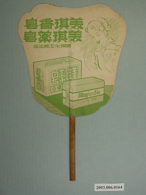 1.此件團扇採用燈籠形扇框、雙扇面,扁方形扇柄。扇面紋樣方面,一面為藍綠色底,繪有兩隻雀鳥站在葡萄藤架上。扇面右上方寫有「為維護文化歷史而戰」字樣,扇面下方則有「華美」字樣。扇面另一面則是美琪藥皂廣告,寫有「美琪藥皂」、「美琪化工廠出品」等字樣,並畫有女性面帶笑容看著美琪藥皂的圖案。2. 日治時期臺灣就開始使用扇子作為廣告宣傳品,在氣候炎熱且電扇、冷氣尚未普及的臺灣,扇子是實用性很高的廣告宣傳品。館藏登錄號2003.006.0160至館藏登錄號2003.006.0168均為美琪藥皂廣告宣傳品,均是一面為