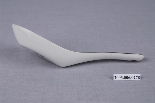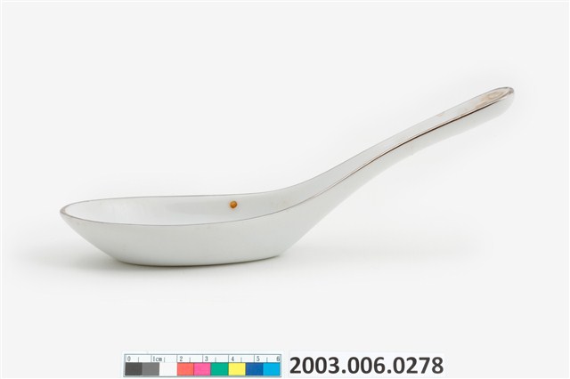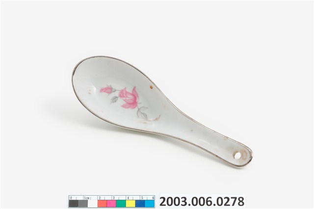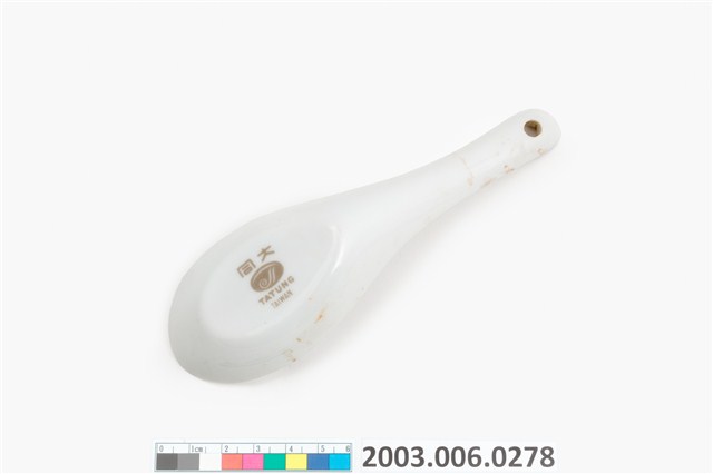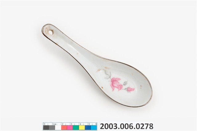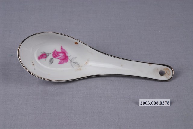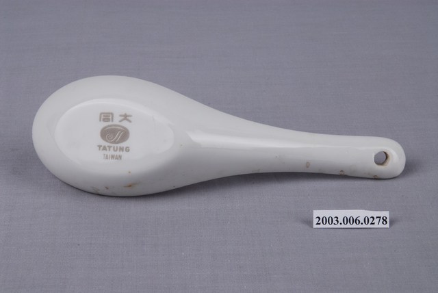 1.這件花卉紋湯匙以壓模製成胎體,為臺灣早期鶯歌或北投地區大量生產的食器。湯匙裡花卉為玫瑰樣式的身體輪廓以印模蓋上色釉,再加上部分手繪。「花卉紋」常見於臺灣早期陶瓷製湯匙裝飾,象徵吉慶祥瑞。常見紋飾有牡丹,象徵富貴;菊花,象徵長壽;蓮花,象徵高節;松竹梅,象徵清高。本件為大同公司委託窯廠代工。2.柄端有孔的湯匙是由林葆家研發,用吊燒的方法,提高生產效率,亦讓湯池底部易於上釉,增加精緻度。湯匙底部印「大同TATUNG TAIWAN」字樣,為大同磁器股份有限公司商標。