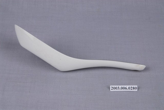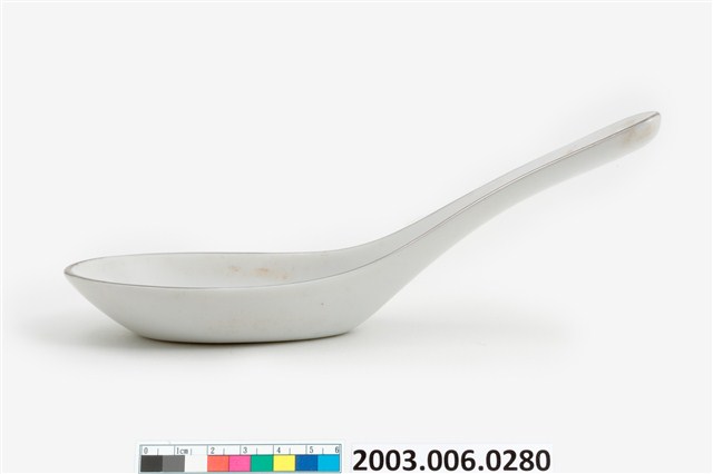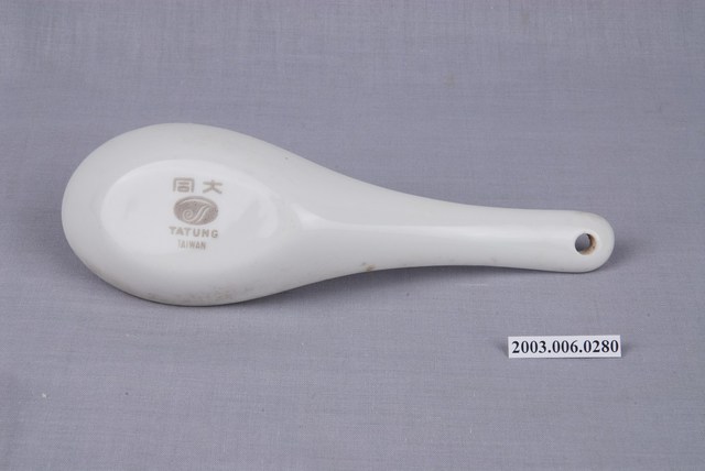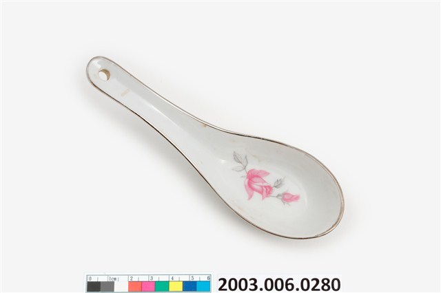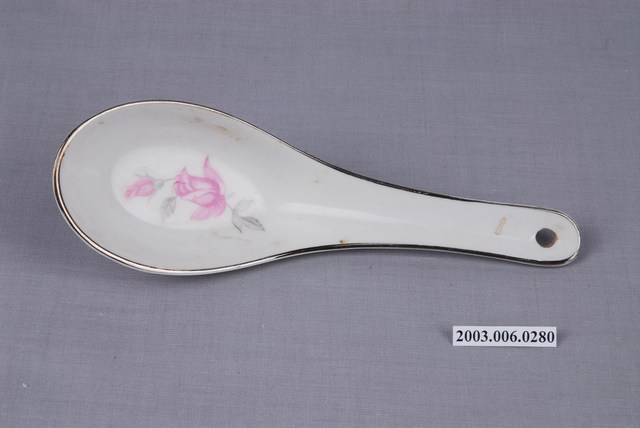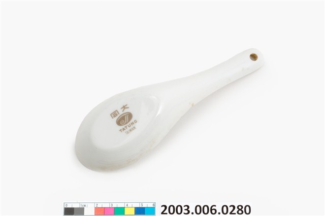 1.這件花卉紋湯匙以壓模製成胎體,為臺灣早期鶯歌或北投地區大量生產的食器。湯匙裡花卉為玫瑰樣式的身體輪廓以印模蓋上色釉,再加上部分手繪。「花卉紋」常見於臺灣早期陶瓷製湯匙裝飾,象徵吉慶祥瑞。常見紋飾有牡丹,象徵富貴;菊花,象徵長壽;蓮花,象徵高節;松竹梅,象徵清高。2.柄端有孔的湯匙是由林葆家研發,用吊燒的方法,提高生產效率,亦讓湯池底部易於上釉,增加精緻度。湯匙底部印「大同TATUNG TAIWAN」字樣,為大同磁器股份有限公司商標。本件為大同公司委託窯廠代工。