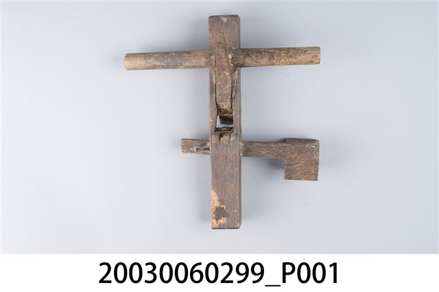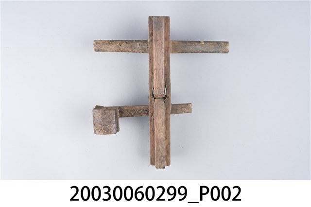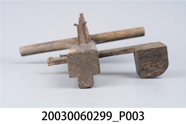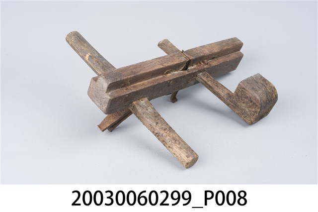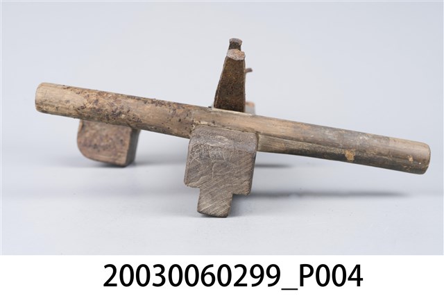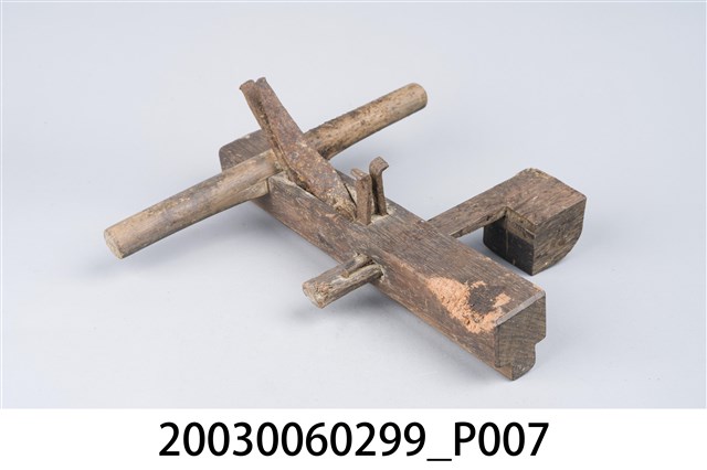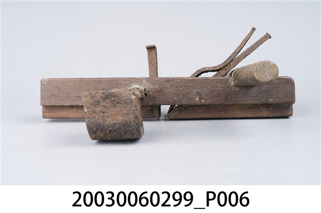 本件文物為木工工具鉋刀的一種,名為邊鉋。本件邊鉋的鉋臺主要由一塊長方形木塊、一塊L形木塊,以及圓形木棒把手組成。鉋刃位於長方形木塊上,為鉋削面,無鉋刃的木塊側面用以緊靠木料固定。兩個木塊垂直相嵌,中以鐵釘作插銷,兩木塊的距離可調整,以調整鉋削的水平位置。邊鉋的功能是鉋出門、窗的軌道凹槽。基本造型的鉋臺底部為平面,鉋刃與鉋臺相同寬度,因此鉋出的凹槽與鉋臺寬度相同。本件邊鉋鉋刃置於鉋臺中央最底面的平面,鉋臺兩側九十度凹起,鉋出的凹槽深度即兩側凹起的高度。鉋刃前有兩支前導針,用以畫線定位。鉋刃口長度1.8公分。本件鉋臺局部磨損。