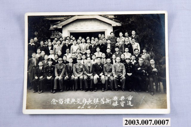 此物件為黑白照片,為團體合照,背景為通霄鎮舊鎮公所正門,相片底部有白色字體註記「苗栗縣通霄鎮新舊鎮長移交典禮留念 42.4.1」,其中第一排由左數來第6位人物為時任鎮長的徐運火。 此物件提到之人物為徐運火為湯霄鎮的第二、三屆的民選鎮長,曾在1966年擔任苗栗縣議員。在其於1953年至1960年的鎮長任內籌設各級學校,並向國防部申請開放通霄海水浴場。 通霄位於苗栗縣西南部的沿海地區。此地最早為原住民道卡斯族「風呢樣」(Honeyan)聚落所在地。明鄭時期記載為「吞宵社」,並與另外七個聚落合稱「蓬山八社」,後於日治時期改名為「通霄」。通霄的大規模開墾始於康熙年間,此時期多為原住民開墾,後來於乾嘉年間閩粵人士才先後到來此地。