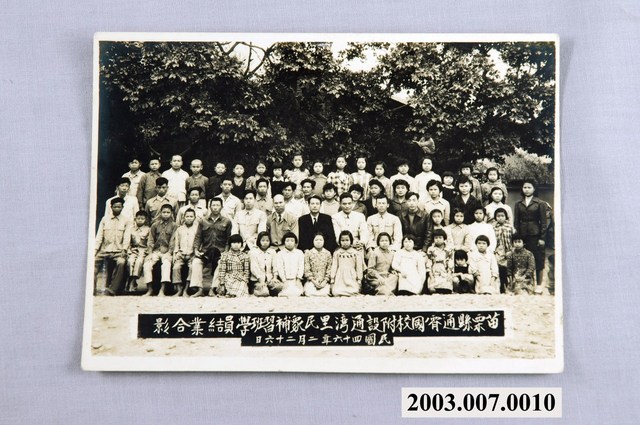 "1.本文物為黑白攝影照片,團體大合照,上有「苗栗通霄國校附設通灣里民眾補習班學員結業留念,民國四十六年二月二十六日攝」,人數為六十人,成人孩童皆有,女性36人,男性24人,孩童約有25人,成年男性多著卡其制服,女性女性多著各式洋裝。