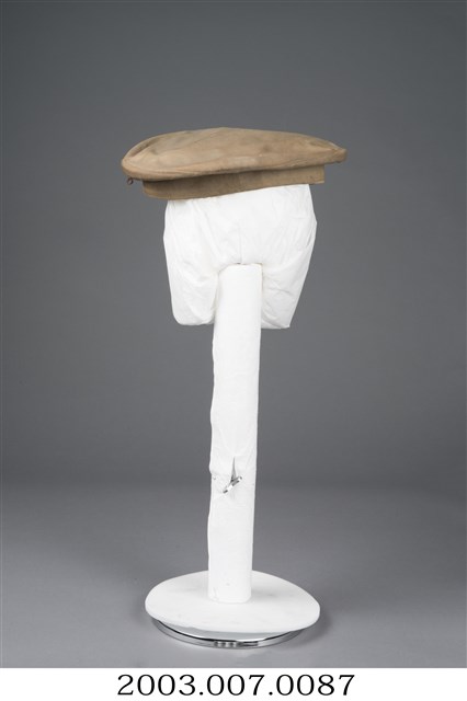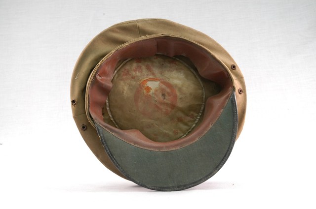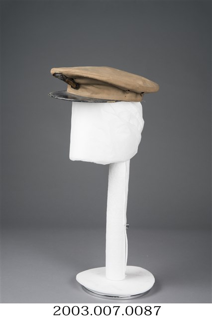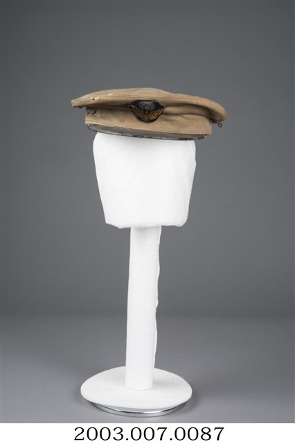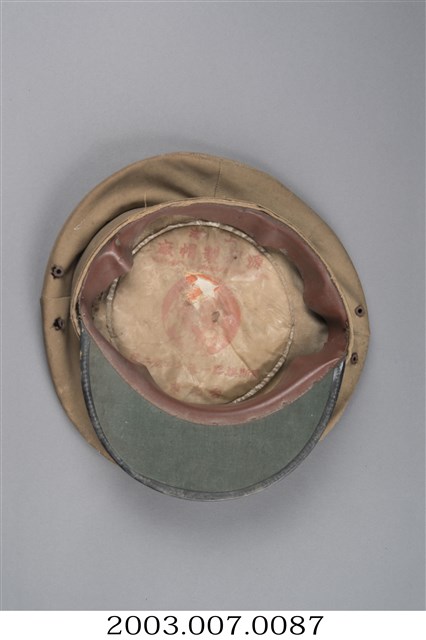 1.此件警察大盤帽正面有黑色盾形為地、中嵌警徽的帽徽,帽簷、帽絆為黑色膠片,警帽兩側各有一金屬梅花徽帽釘,用以固定帽絆於帽牆上。帽裡的帽頂中心有圖騰,然圖騰破損嚴重,難以辨認。圖騰上方印有紅字「上海源利製帽廠」字樣,顯示製作工廠資訊。此警帽與館藏登錄號2003.007.0085、2003.007.0086同為上海源利製帽廠製作,然而字樣安排略有變化,顯示並非同一批產品。2.警察大盤帽為警察執勤時固定配備,而警帽上的警徽則可辨認階級。