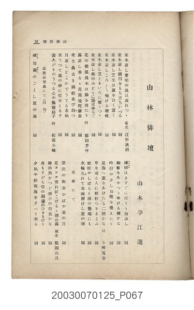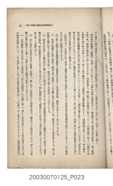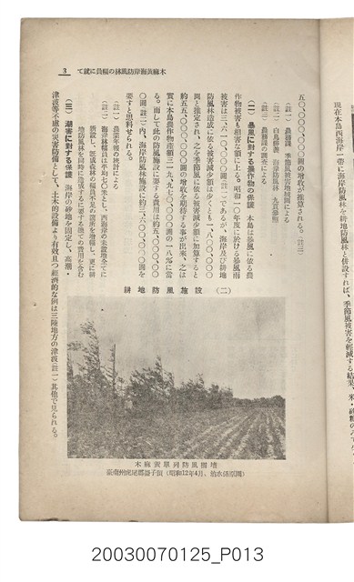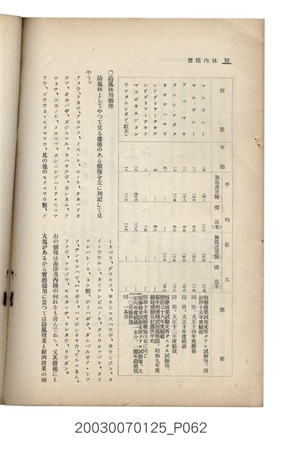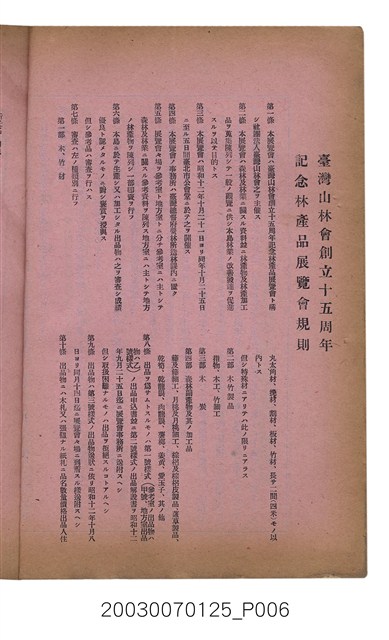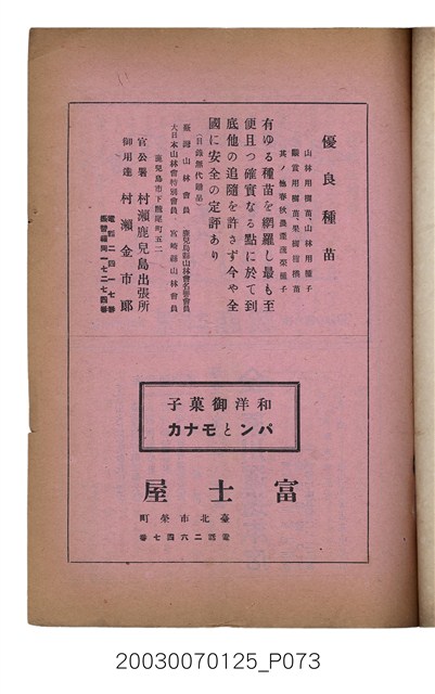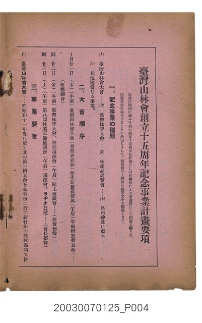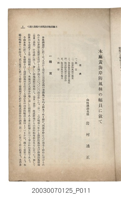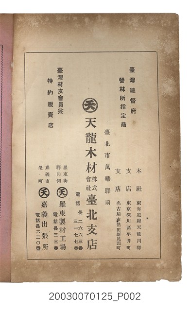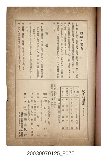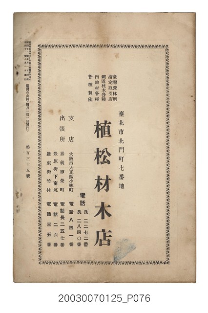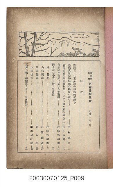 1. 本書為社團法人臺灣山林會所發行的《臺灣的山林》,內容主要收錄了許多日本學者針對臺灣的山林地區、林業、公園事業、礦業等領域的研究發表文章。本書於昭和12年7月2日發行,為每月初發行的刊物;此為第135號。其中刊登了臺灣山林會創立十五周年記念事業計畫要項,其記念事業包括臺灣山林會大會、熱帶林學大會、林產品展覽會、島內神社に獻木等;其所收錄的文章有:卷頭言:林業臺灣の積極的展開を、木麻黃海岸防風林の幅員に就て、錫蘭、印度、東阿弗利加、マダガスカル旅行談、佛領印度支那に於ける安南漆、淡水河の今昔を語る座談會、林內隨想、林叢漫言、山林俳壇等。內含多則廣告,例如:天龍木材株式會社臺北支店、官公署村瀨鹿兒島出張所(優良種苗)、富士屋和洋御菓子、荒井商店、原川運送本店、植松材木店等。
