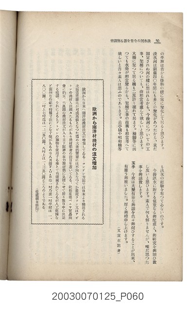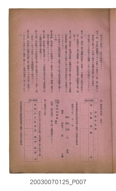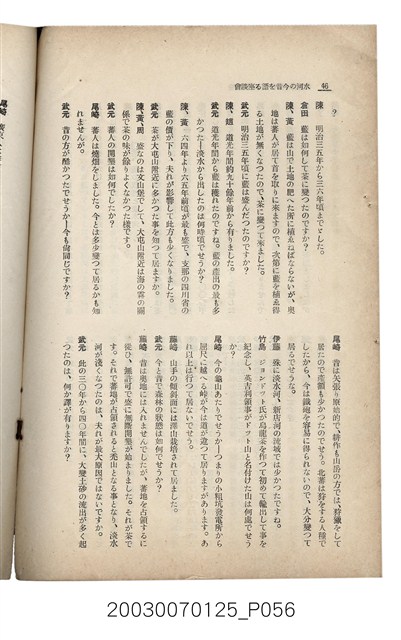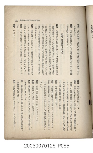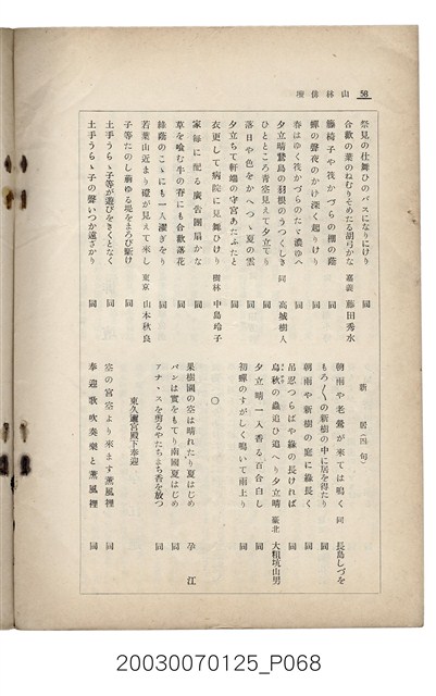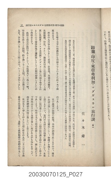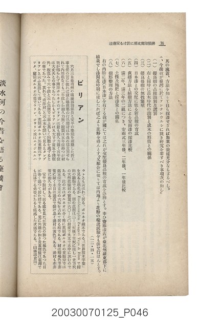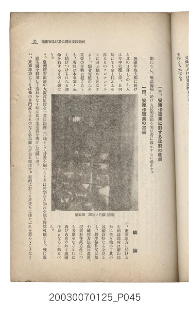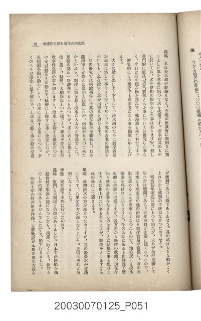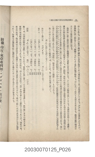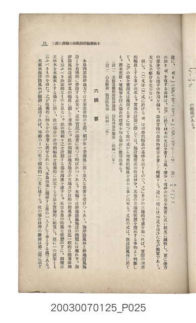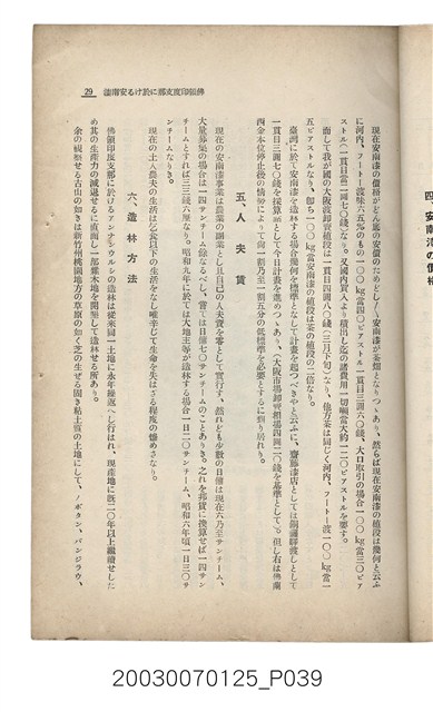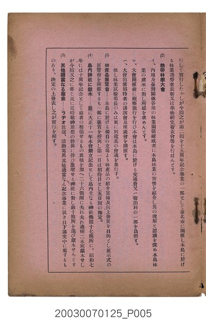 1. 本書為社團法人臺灣山林會所發行的《臺灣的山林》,內容主要收錄了許多日本學者針對臺灣的山林地區、林業、公園事業、礦業等領域的研究發表文章。本書於昭和12年7月2日發行,為每月初發行的刊物;此為第135號。其中刊登了臺灣山林會創立十五周年記念事業計畫要項,其記念事業包括臺灣山林會大會、熱帶林學大會、林產品展覽會、島內神社に獻木等;其所收錄的文章有:卷頭言:林業臺灣の積極的展開を、木麻黃海岸防風林の幅員に就て、錫蘭、印度、東阿弗利加、マダガスカル旅行談、佛領印度支那に於ける安南漆、淡水河の今昔を語る座談會、林內隨想、林叢漫言、山林俳壇等。內含多則廣告,例如:天龍木材株式會社臺北支店、官公署村瀨鹿兒島出張所(優良種苗)、富士屋和洋御菓子、荒井商店、原川運送本店、植松材木店等。