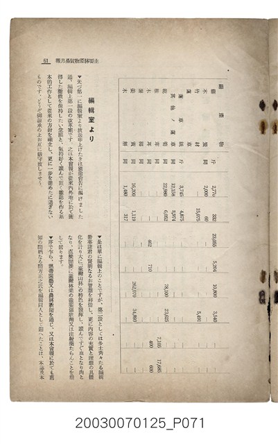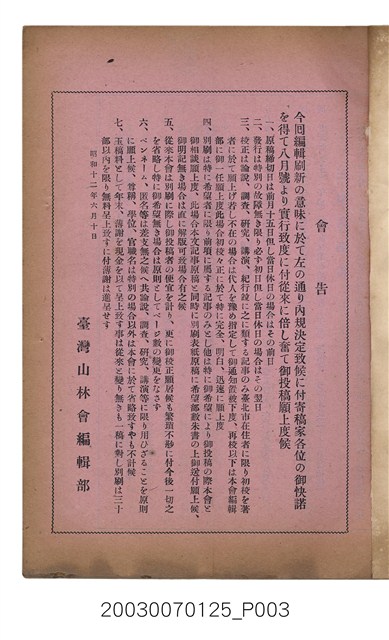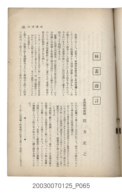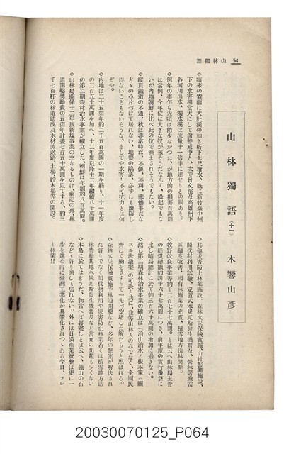 2. 本書原名為《臺灣山林會報》,最早發行於大正12年(1924),於第80期後更改為《臺灣の山林》。日治時期臺灣總督府為有效利用森林,於1925年實施了森林計劃,主要針對治水及國土保安。