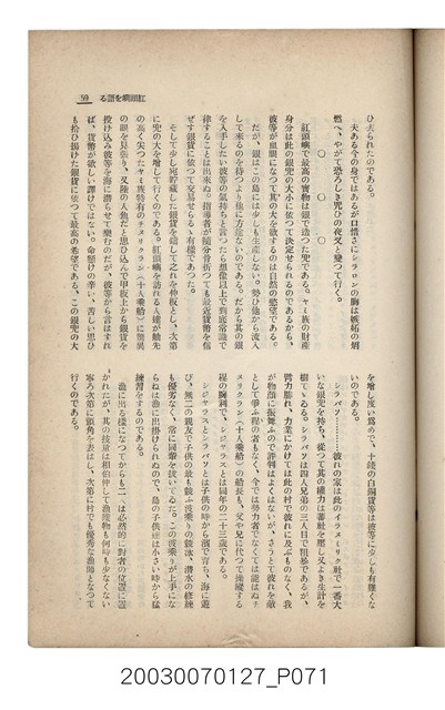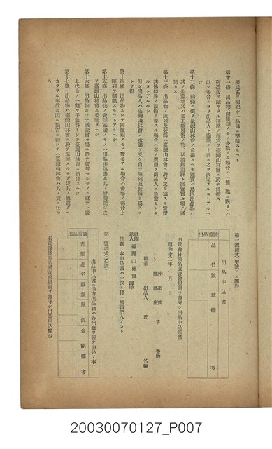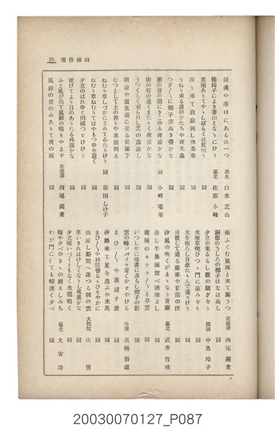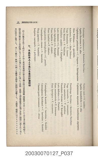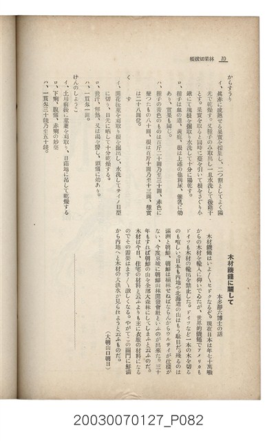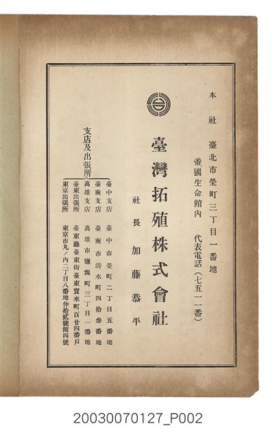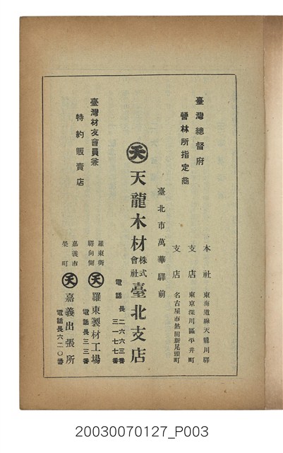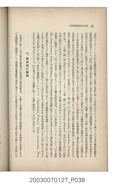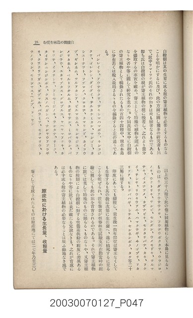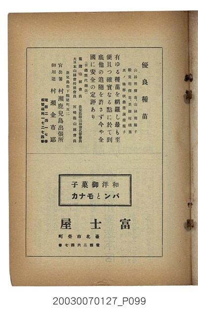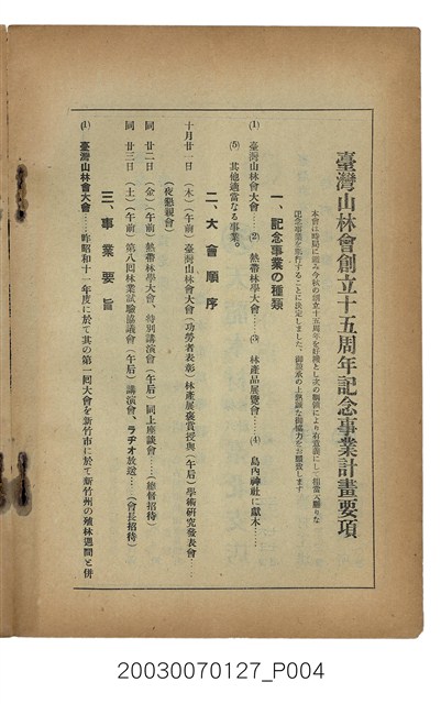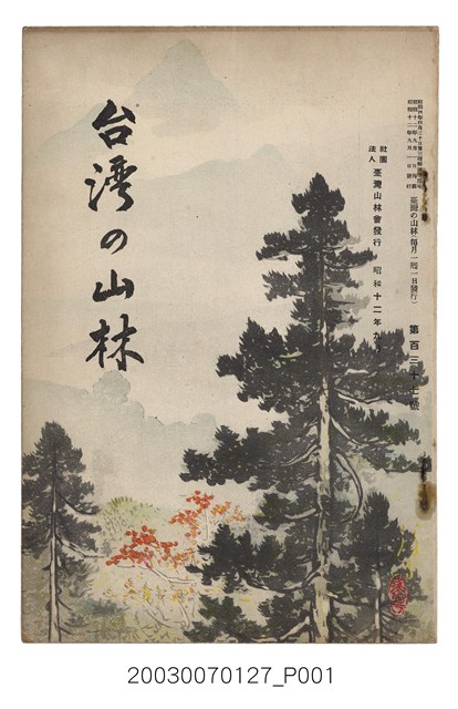 1. 本書為社團法人臺灣山林會所發行的《臺灣的山林》,內容主要收錄了許多日本學者針對臺灣的山林地區、林業、公園事業、礦業等領域的研究發表文章。本書於昭和12年9月2日發行,為每月初發行的刊物;此為第137號。本期刊登了臺灣山林會創立十五周年記念事業計畫要項,其記念事業包括臺灣山林會大會、熱帶林學大會、林產品展覽會、島內神社に獻木等。其所收錄的文章有:卷頭言:時局と臺灣の林業、東亞大陸針葉樹綜攬、樟腦林地內の蔓性植物について、白檀の植栽を勸む、林內隨想、タイワングルの利用價值、紅頭嶼を語る、山林俳壇等。口繪圖有憩へる舟及海岸林之二風景。另外,本刊也刊登了多則廣告,例如:臺灣拓殖株式會社、天龍木材株式會社臺北支店、官公署村瀨鹿兒島出張所(優良種苗)、富士屋和洋御菓子、荒井商店、原川運送本店、植松材木店等。