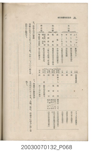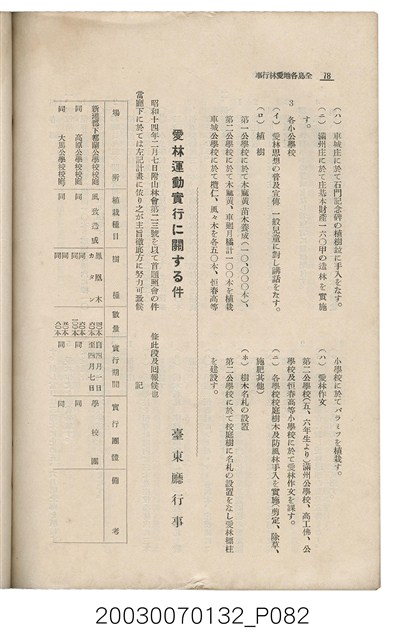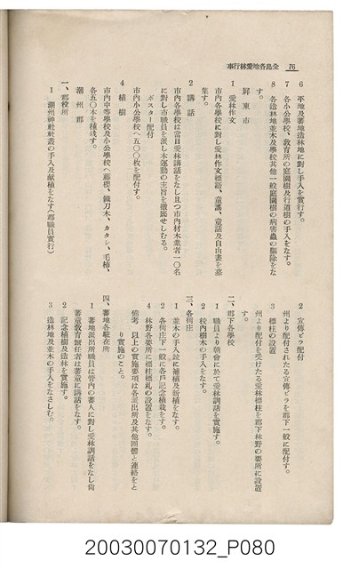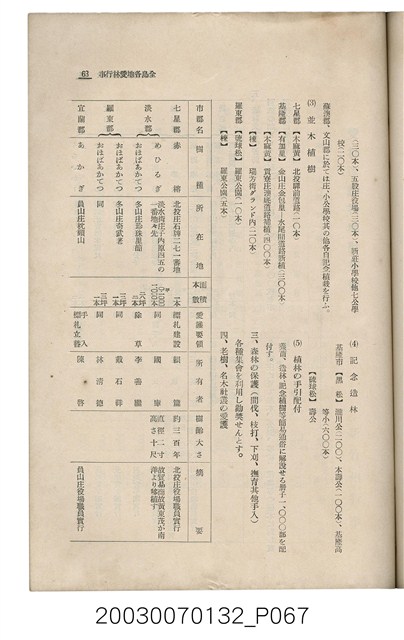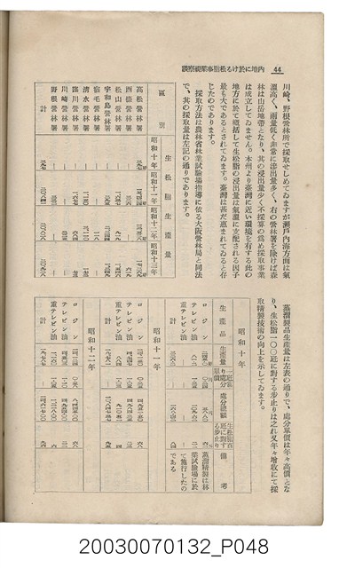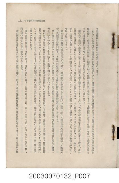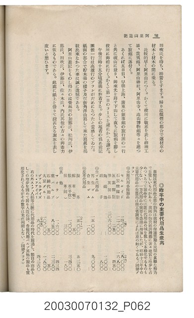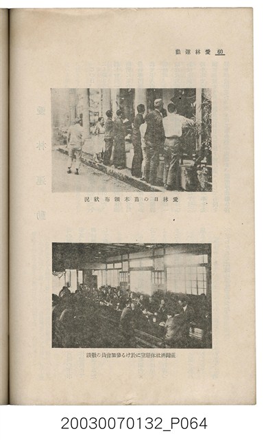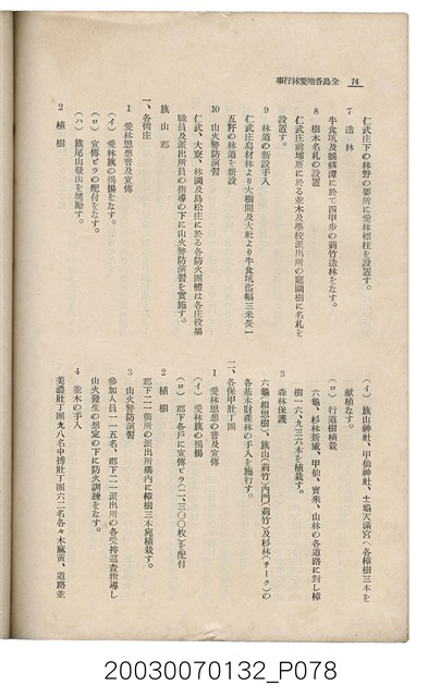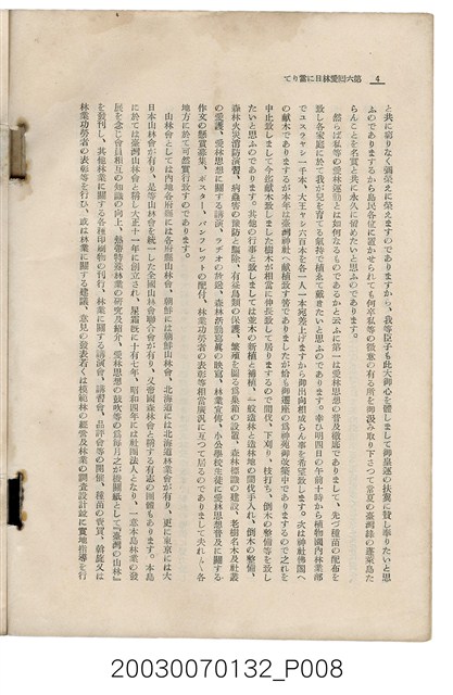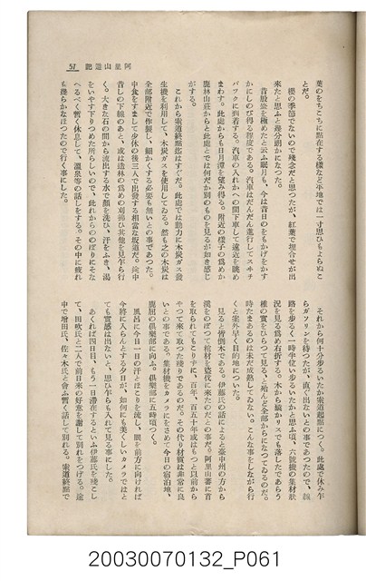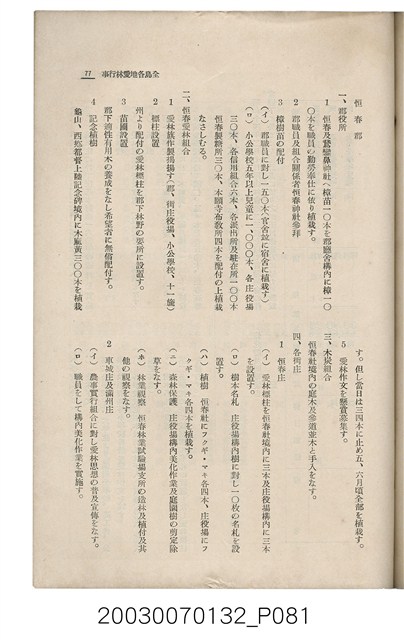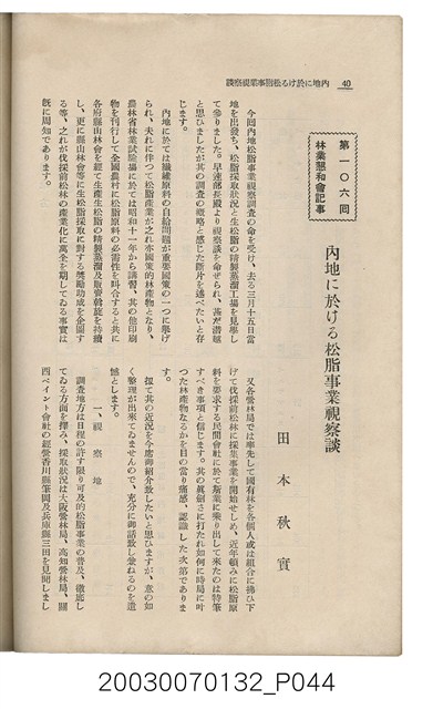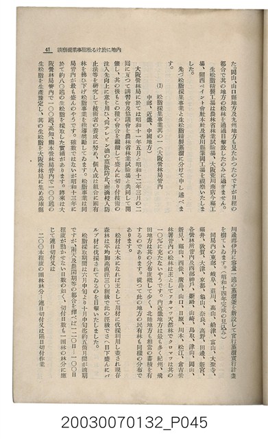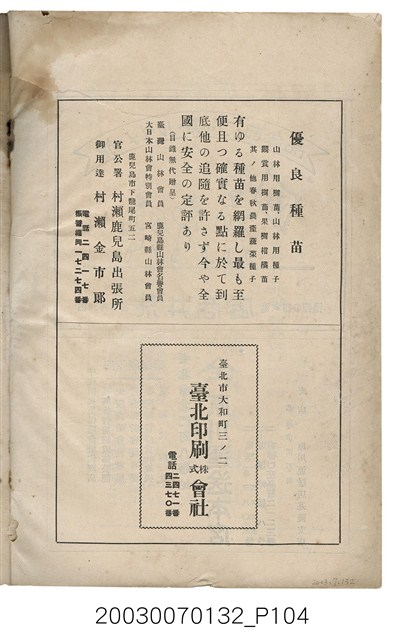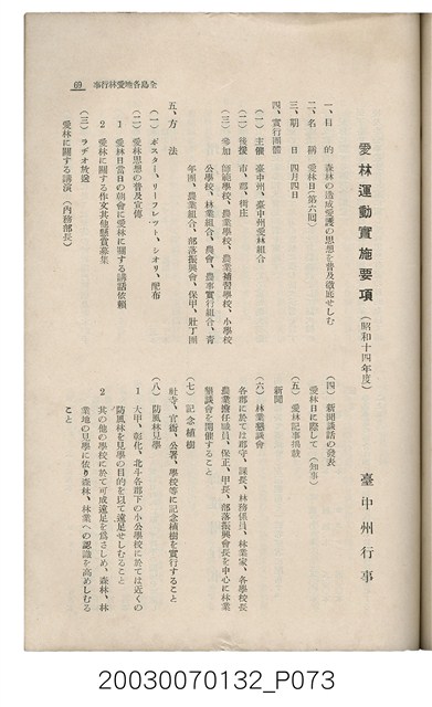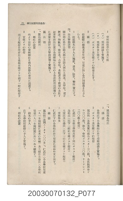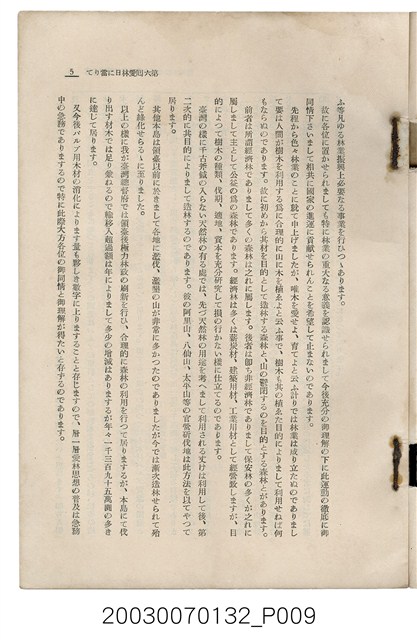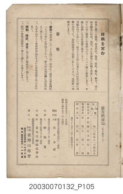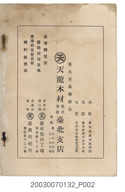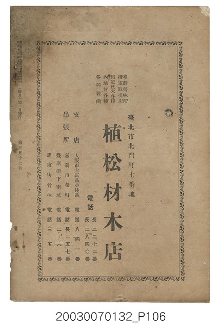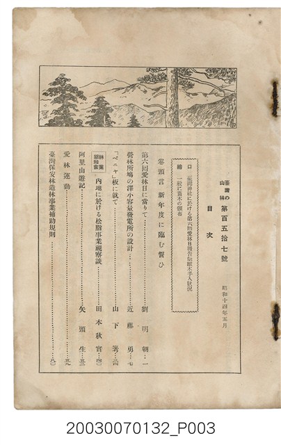 1. 本書為社團法人臺灣山林會發行的《臺灣的山林》,內容主要收錄了許多日本學者針對臺灣的山林地區、林業、公園事業、礦業等領域的研究發表文章。本書於昭和14年5月6日印刷及發行,為每月初發行的刊物;此為第157號。本刊收錄了兩幅口繪圖:臺灣神社に於はる第六回愛林日報告祭獻木手入狀況及一般に苗木の頒布;除了卷頭言:新年度に臨む誓ひ,另外收錄了七篇文章:第六回愛林日に當りて、營林所鳩 の澤小容量發電所の設計、ベニヤ板に就て、內地に於ける松脂事業視察談、阿里山遊記、愛林運動及臺灣保安林造林事業補助規則。其中也刊登了多則廣告,例如:天龍木材株式會社臺北支店、臺灣拓殖株式會社、荒井商店、原川運送本店、官公署村瀨鹿兒島出張所(優良種苗)、臺北印刷株式會社等。