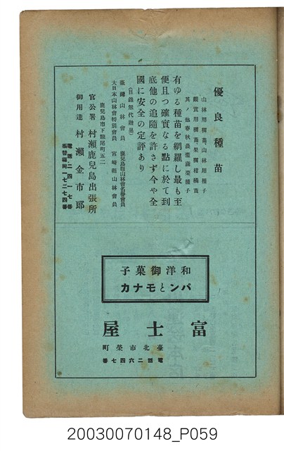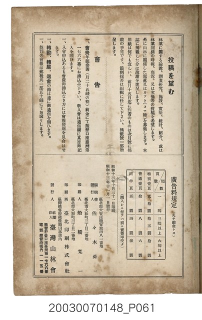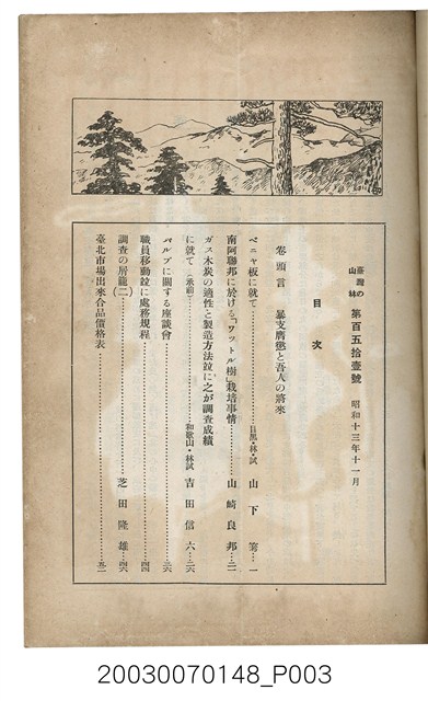 2. 本書原名為《臺灣山林會報》,最早發行於大正12年(1924),於第80期後更改為《臺灣の山林》。日治時期臺灣總督府為有效利用森林,於1925年實施了森林計劃,主要針對治水及國土保安。