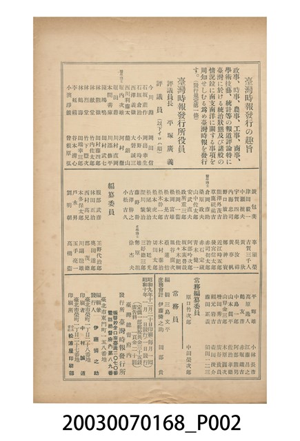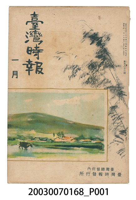 此為一紙質雜誌,並在封面左上方寫有本雜誌的標題以及該雜誌的期號,右下方則有細長字體標明此物件的出版者,而封面中央則畫有地方農村的插圖以及竹林的水墨畫。此書為臺灣總督府內臺灣時報發行所1935年出版之《臺灣時報》一月號。 《臺灣時報》為1919年創辦的日文雜誌,1945年停刊。主要刊載內容有教育、司法、文藝、農產、貿易等各個面向的論文,本書便是其中之一。此刊物的前身可追溯至日本治臺初期的殖民研究計畫,即1898年由「臺灣協會」發行的機關刊物《臺灣協會會報》。