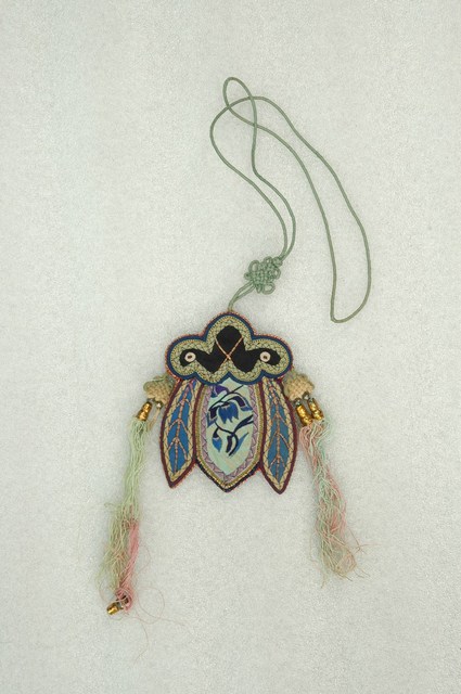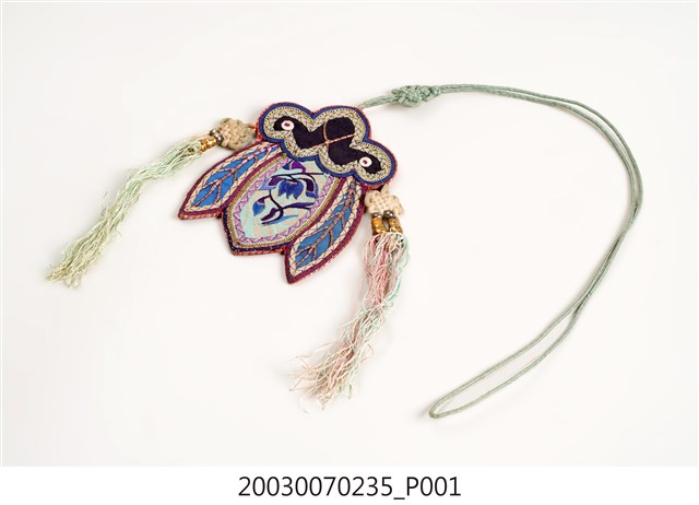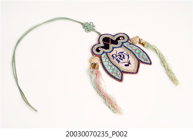1.本物件為煙草袋,外型為蟬的形狀,上半部主要為黑色,下半部則為淺色系,上有多種顏色的絲線,整體視覺上繽紛燦爛,上端亦有絲線可以繫於煙桿上,煙草袋兩側上繡有藍色花草圖樣。