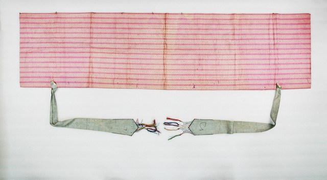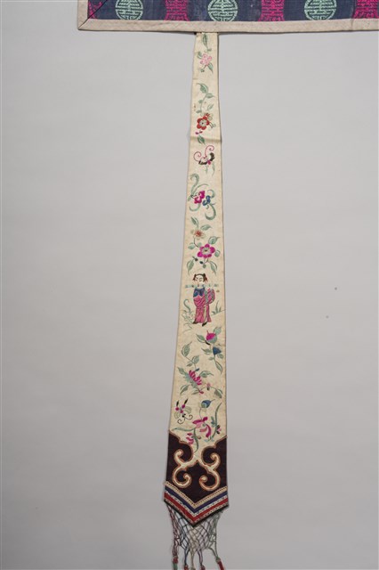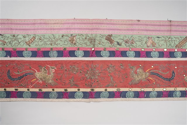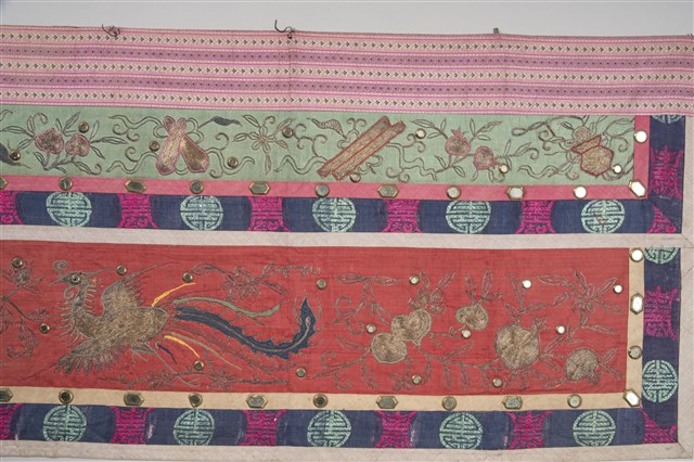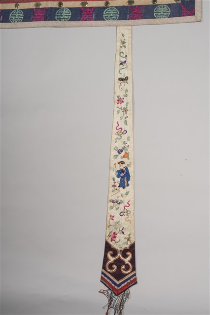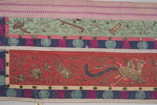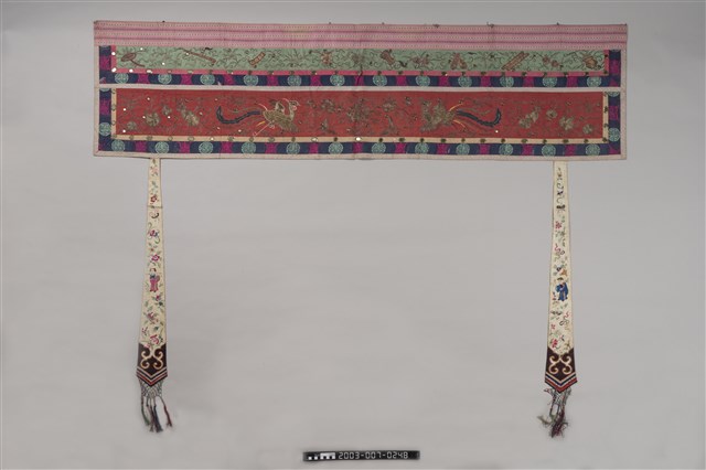 1. 本件主要圖案分成上、下框,外圍皆有一層黃布,原先應該有小圓鏡為裝飾但已脫落,最外層則有花草紋飾。上框圖案以「盤金繡」(以金線盤出圖案)技法為主,內容是博古香爐、花瓶、爵杯等器物,兩旁則有節瓜、花籃等,並有枝葉紋環繞其間。下框則以紅布為底,構圖技法是使用「平金繡」(以金線、有色絲線為鋪釘),充滿許多人物,其中可看出有人在舞龍舞獅、放風箏、蹴鞠(踢足球),表現出喜慶的氣氛。本件背面是整塊素面粉布,無任何花紋。2. 「博古」是由宋朝開始圖繪古代器物造型,供皇帝欣賞閱覽,後來民間將此圖繪裝飾於花瓶、屏風、