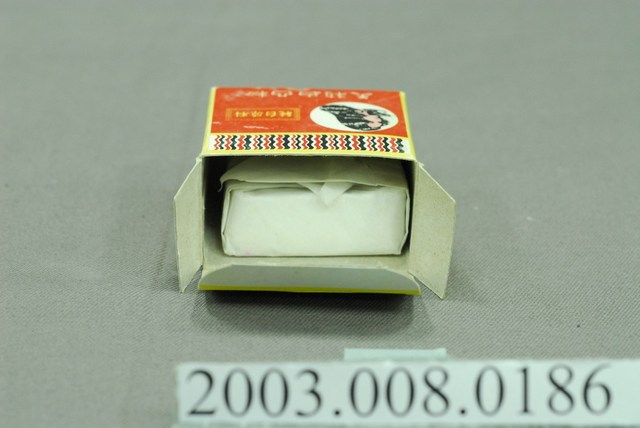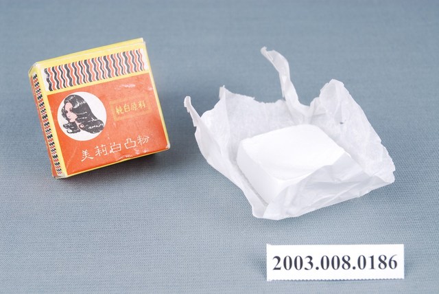 美莉白凸粉為2部件組合而成之藏品,可分為包裝盒與粉餅。包裝盒作表面印刷,上下端皆可開闔。粉餅以粉紅色包裝紙包裹,呈圓形扁狀粉塊。白凸粉又稱香粉或澎粉,全臺香粉製作生產以新竹為重鎮,自清光緒年間即有紀錄,日治時期總督府大力推廣地方特產,使產量到達高峰,1950到1960年代為全盛時期,曾大量外銷日本與東南亞等地。美香粉為傳統婦女之化妝品,也用於挽面,更是農曆7月7號「七巧節」時祭拜織女的必需供品,此外於白布鞋髒汙處直接以粉塊塗抹,可遮蓋髒汙以及黃化。由於白鞋粉與香粉之製作原料與工序相似,因此多為製作香粉的工廠一同生產。