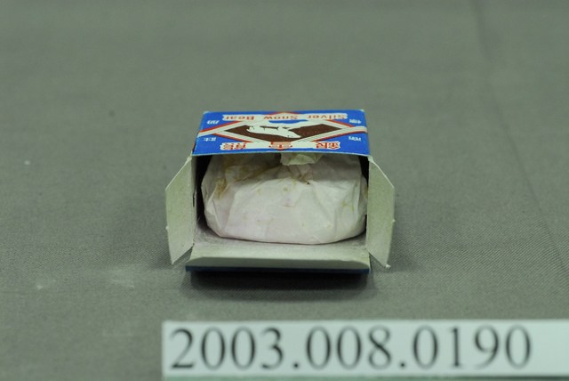 1. 銀雪熊頂好用白粉,共1組2件,包括外盒與白粉餅兩個部分。2. 外包裝盒為厚紙製作之方形紙盒,表面印刷商品名與店名,並於表面印刷圖案,側面開闔。3. 粉餅以白色紙張包裹,呈潔白色澤之方形扁狀粉塊。白粉是早期婦女使用的粉底,又稱香粉或澎粉,由石灰石和水加以研磨成漿製模曬乾而成。4. 本件為新竹之台新白粉店製造,日治時期已存在,開業確切年份不詳,1999年歇業。5. 新竹因氣候乾燥適合生產白粉,為臺灣生產重鎮,自清光緒年間即有白粉生產之記載,日治時期總督府大力推廣,使產量到達高峰,戰後因貨物稅及外國進口化妝品競爭而逐漸沒落。白粉除作婦女化妝之用外,亦可做為挽臉用品及七夕「乞巧節」祈求織女賜予姣好容貌之祭品;或作為痱子粉,添加茶油或麻油調和後塗在腹部,則成治療小兒脹氣肚痛的古老偏方,亦可用來遮蓋白布鞋的髒汙及黃化。