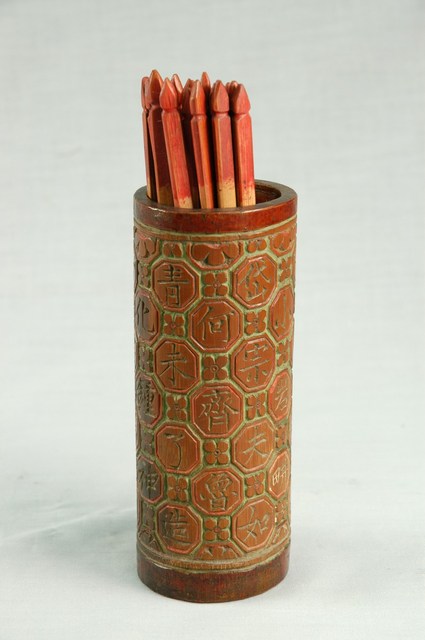 籤的材質主要為竹製品,呈長條形,籤頭多刻為葫蘆或其他形狀,其上並刻有干支或號碼,籤數必須與籤詩相符。籤存放於籤筒中,放置於供桌兩側,供民眾抽取。籤筒是存放籤的容器,多為木製或竹製品,形狀有圓形、四方形、六角形、八角形等,籤筒的高度視籤枝的長度而定,通常為籤枝高度的三分之二。本件為木製圓形雕花籤筒,表面刻有八角形與花朵圖案相間,八角形圖案上刻有「一覽眾山」、「小岩畊」、「岱宗夫如」等文字,上、下緣留邊,漆上淡紅漆。本件為籤附24枝籤,籤頭為箭尖形,籤枝露出籤筒部份漆上紅漆籤尾有缺角造型,每枝籤缺角形造型不同