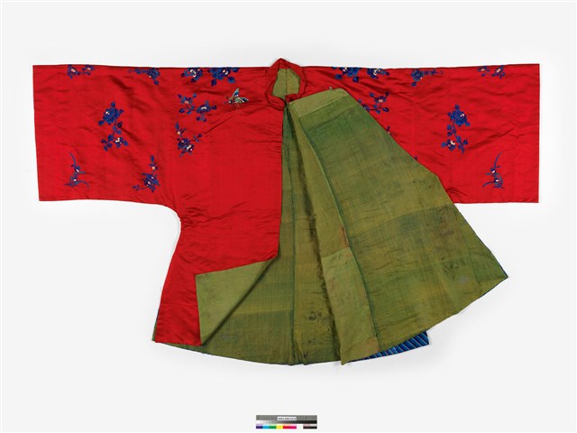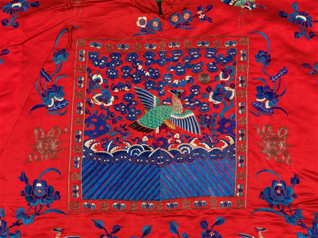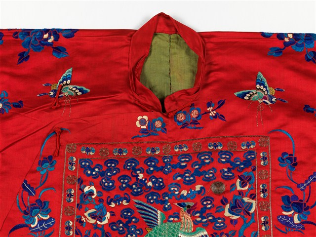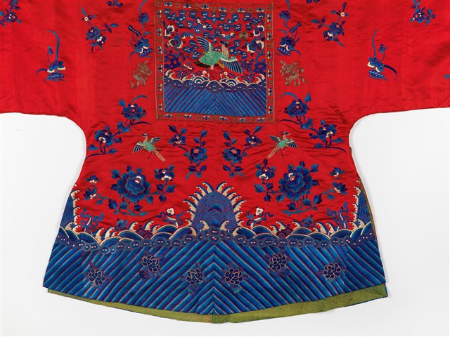 此件服裝表布以大紅絲緞製作,青綠色絲料為裡襯,小立領、右開大襟,衣袖寬大,在衣領頷下、大襟、腋下以及脇邊縫有布結紐頭的直布扣,衣身前後各刺繡補子紋飾,補紋為溪鶒(清代七品文官),衣襬刺繡立水、山石以及海水江牙紋飾,衣服上亦有刺繡花紋,有牡丹、菊花、茶花、佛手、佛家八寶、錦雞---等地紋豐富,整體形貌富麗華貴,像是清代品官夫人的禮服。但是,清代漢族品官夫人的禮服,補子是可拆式綴縫上去的形式,並非直接繡在衣服上,綴縫補紋的服裝款式是對襟的外褂形式,而非大襟的結構,此件服裝刺繡精美華麗,但服裝款式像是明式宮裝,但又以布結直布扣(明代以布帶繫結,盤領,補紋也較清式者為大),以種種跡象判斷此為戲劇用服裝。