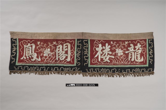 本對帳籬以「龍樓」、「鳳閣」兩件組成一對。「鳳閣龍樓」(亦寫成「龍樓鳳閣」)原為古人譬喻神仙居住處所,或是帝王宮闕的雄偉,如南唐的李煜(936-978)曾寫「鳳閣龍樓連霄漢」,後世以此繡在帳籬、門簾上用以裝飾並作為一種美稱。推測本對帳籬原先應當是宮廟或道壇使用的物品。
