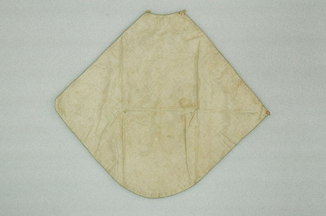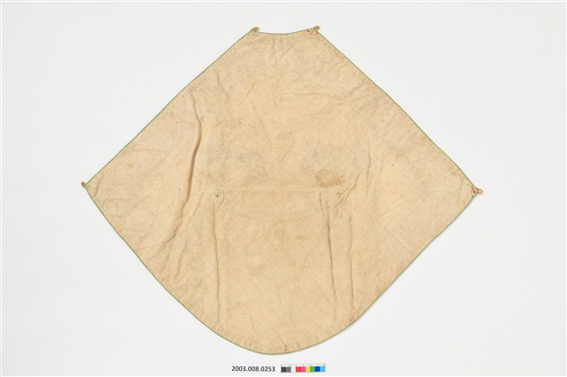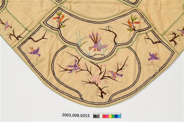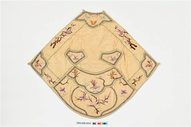 1. 此件肚兜為菱形,正反面均為米色布,有些許污漬。刺繡技法上,結合鎖繡、緞面繡、套針等技法,讓紋樣富層次感。紋樣方面,圍頸部分繡有蝶紋,肚兜兩側繡喜鵲立於梅梢上,腰側繡蝶紋,圍腹口袋蓋片部分中央繡飛鳳,兩側繡雀鳥,口袋部分則繡兩隻喜鵲立於梅梢上對望。鳳凰為瑞獸,蝴蝶的蝴與福諧音,喜鵲立於梅梢寓意喜上眉梢,故此件肚兜充滿喜慶意涵。此本件肚兜源於臺中霧峰,下方呈圓弧狀。2. 肚兜出現時間不會晚於漢代,隨時代形制、名稱均有改變,至清代開始稱作肚兜,臺灣也承襲此一名稱,別名還有抹胸、裹肚、兜兜等,雖然臺灣肚兜源自中國,但是臺灣肚兜通常先將紋樣繡於布片,再縫於肚兜上,裝飾安排上,紋樣多集中在下方口袋與緄邊,此兩點與中國地區肚兜有很大差別。另外,早期肚兜男女老幼都會使用,口袋部分有時會放置香料或藥材,可見肚兜還有香囊以及藥療的功能。